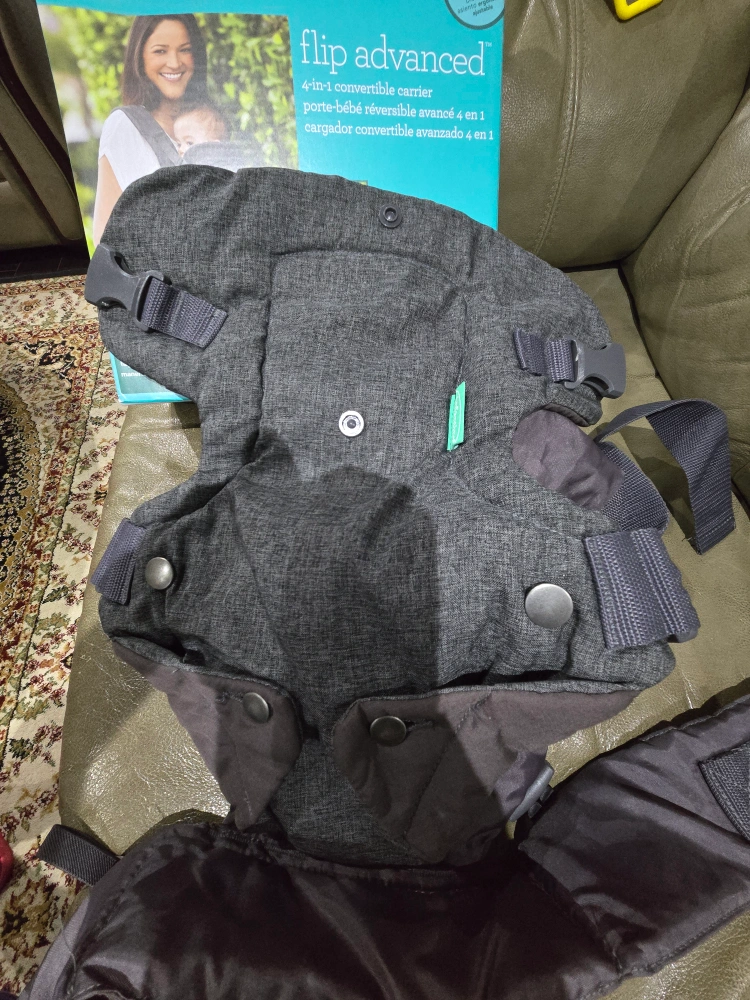 A grey baby carrier that can be used in 4 different ways, from facing in with a folded seat to facing out with an expanded seat.