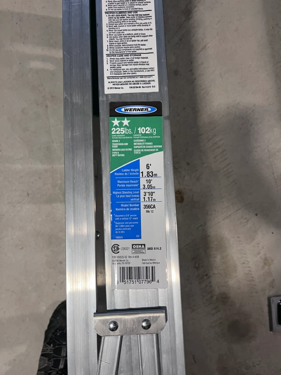 34Selling a Werner aluminum ladder, model 356CA MK 12. It's a 6-foot ladder with a capacity of 225 lbs / 102 kg. Location: Morningside Ave and 401 Or Newmarket
