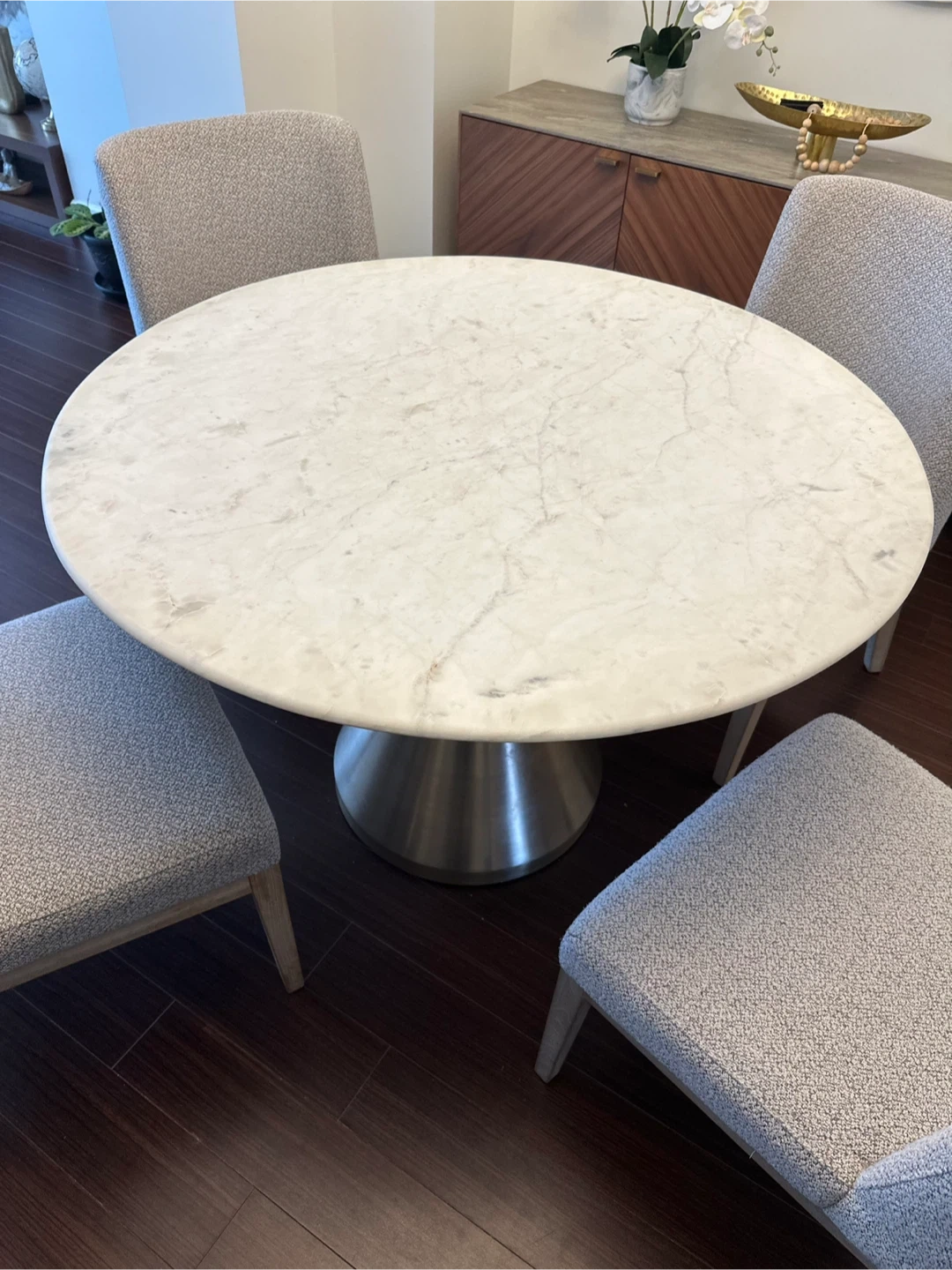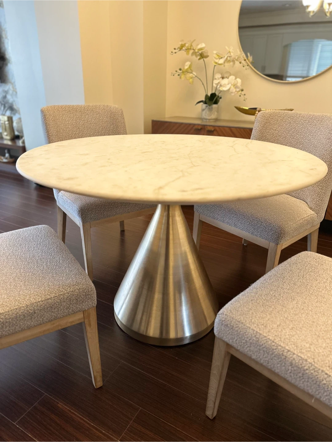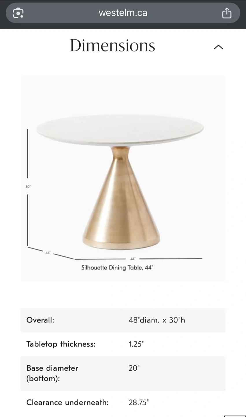 10Selling a West Elm Silhouette dining table in great condition! It features a round marble top and a metallic base. The table is 48 inches in diameter and 30 inches in height. It's a stylish and sturdy piece, perfect for any dining space
