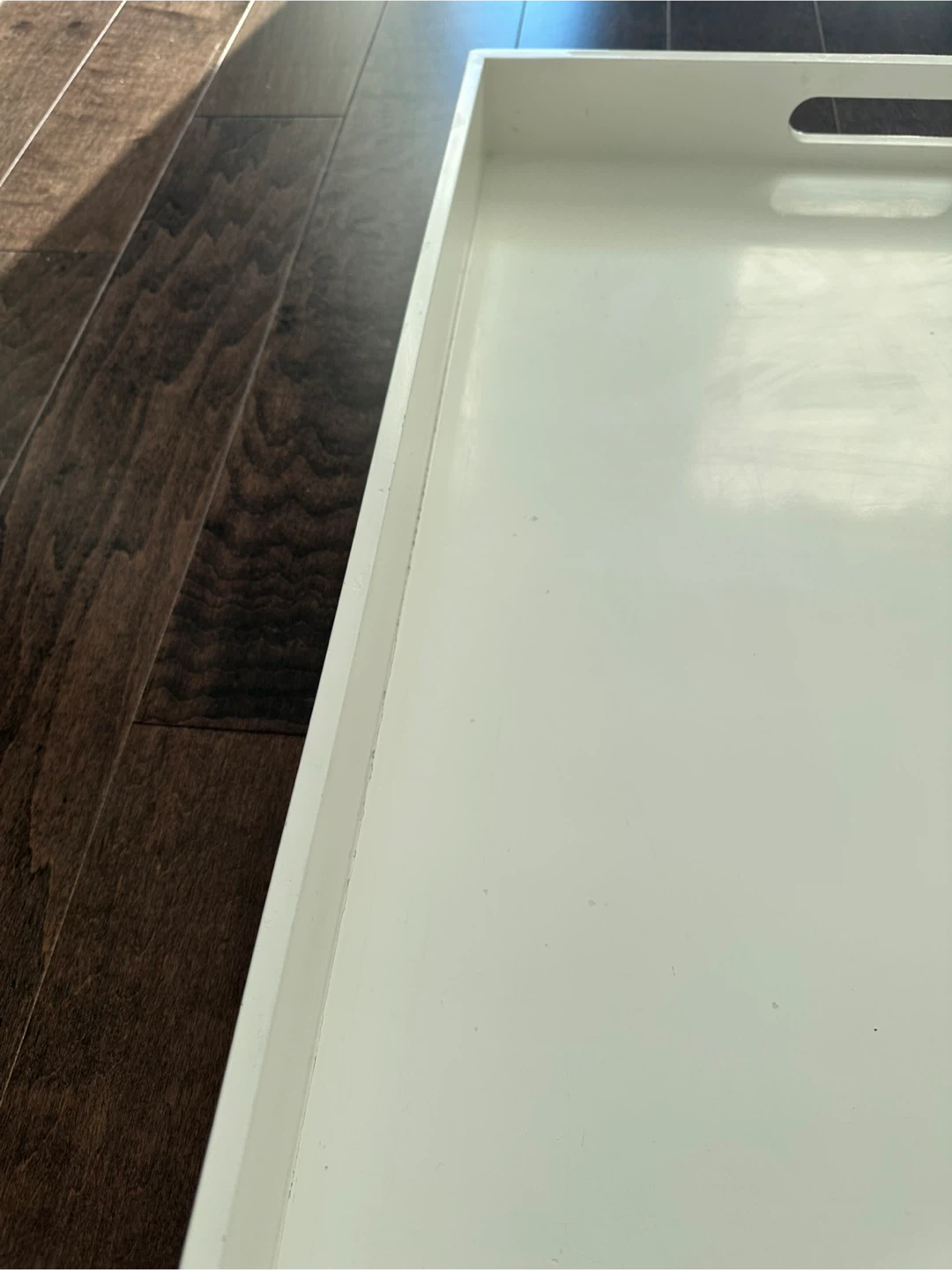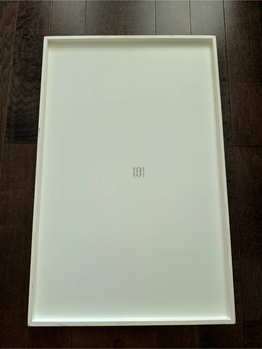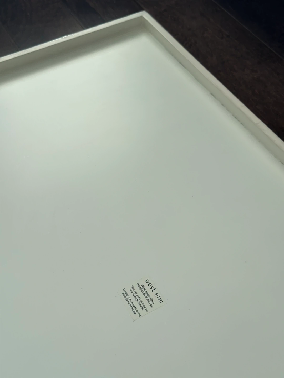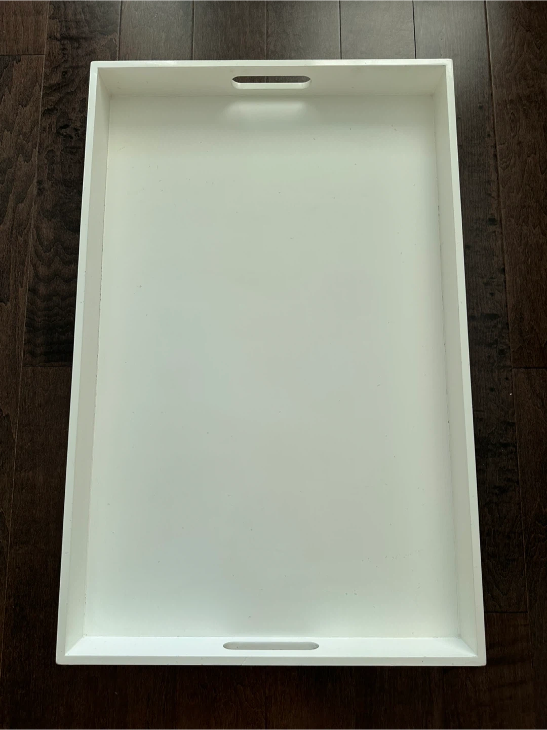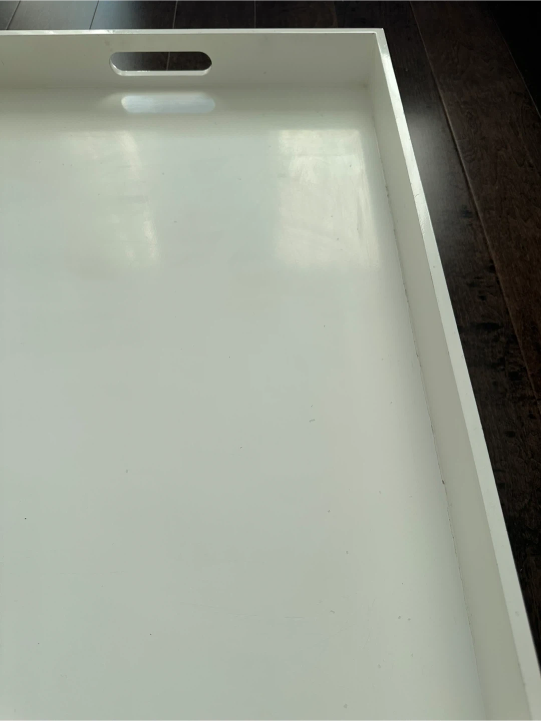 564Selling a West Elm white lacquer tray! It's in great shape and perfect for serving or decor. The tray has handles for easy carrying. The dimensions are approximately 18 inches x 28 inches.