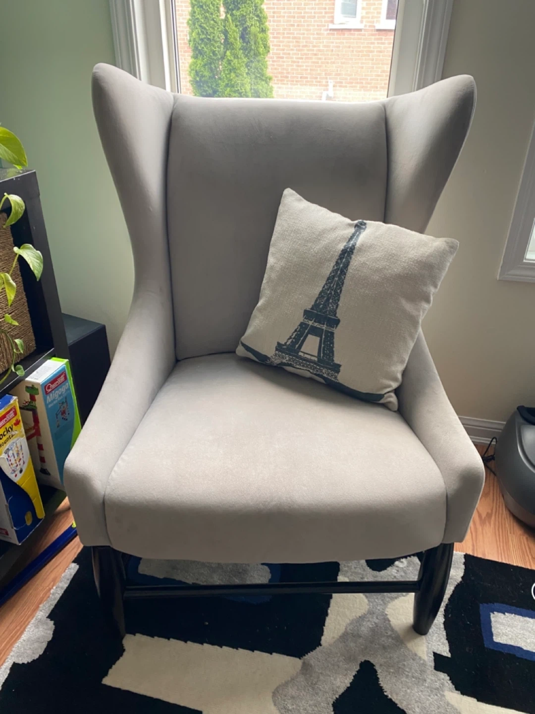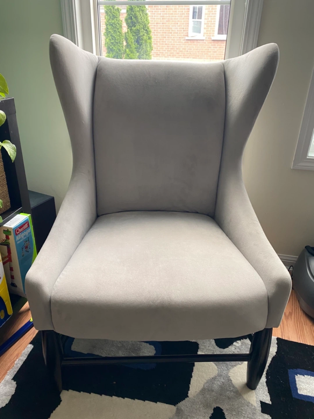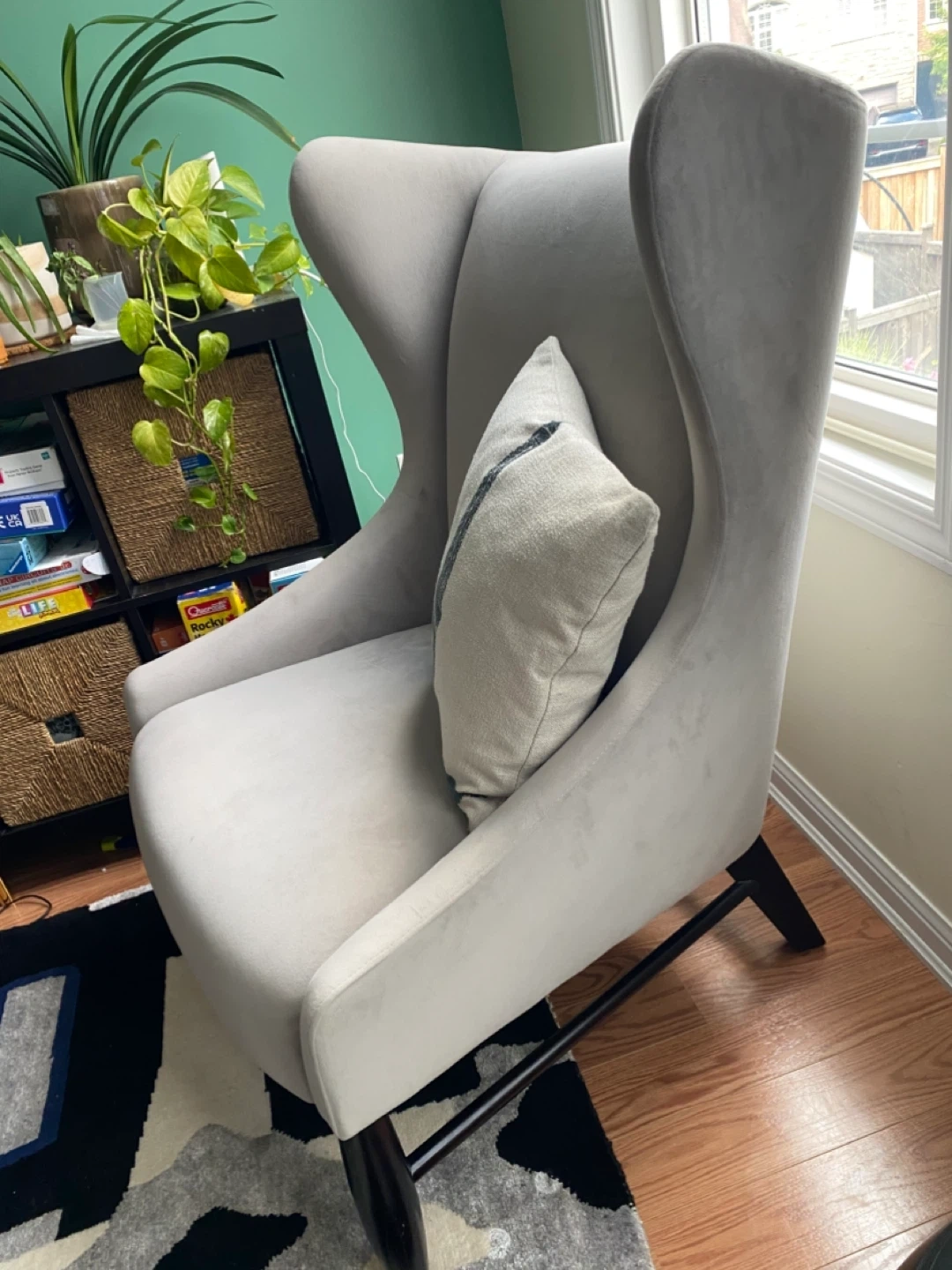 Selling a comfy wingback accent chair in light grey chair from West Elm. It's in great shape and would look lovely in any living room or bedroom. Perfect for adding a touch of elegance to your space