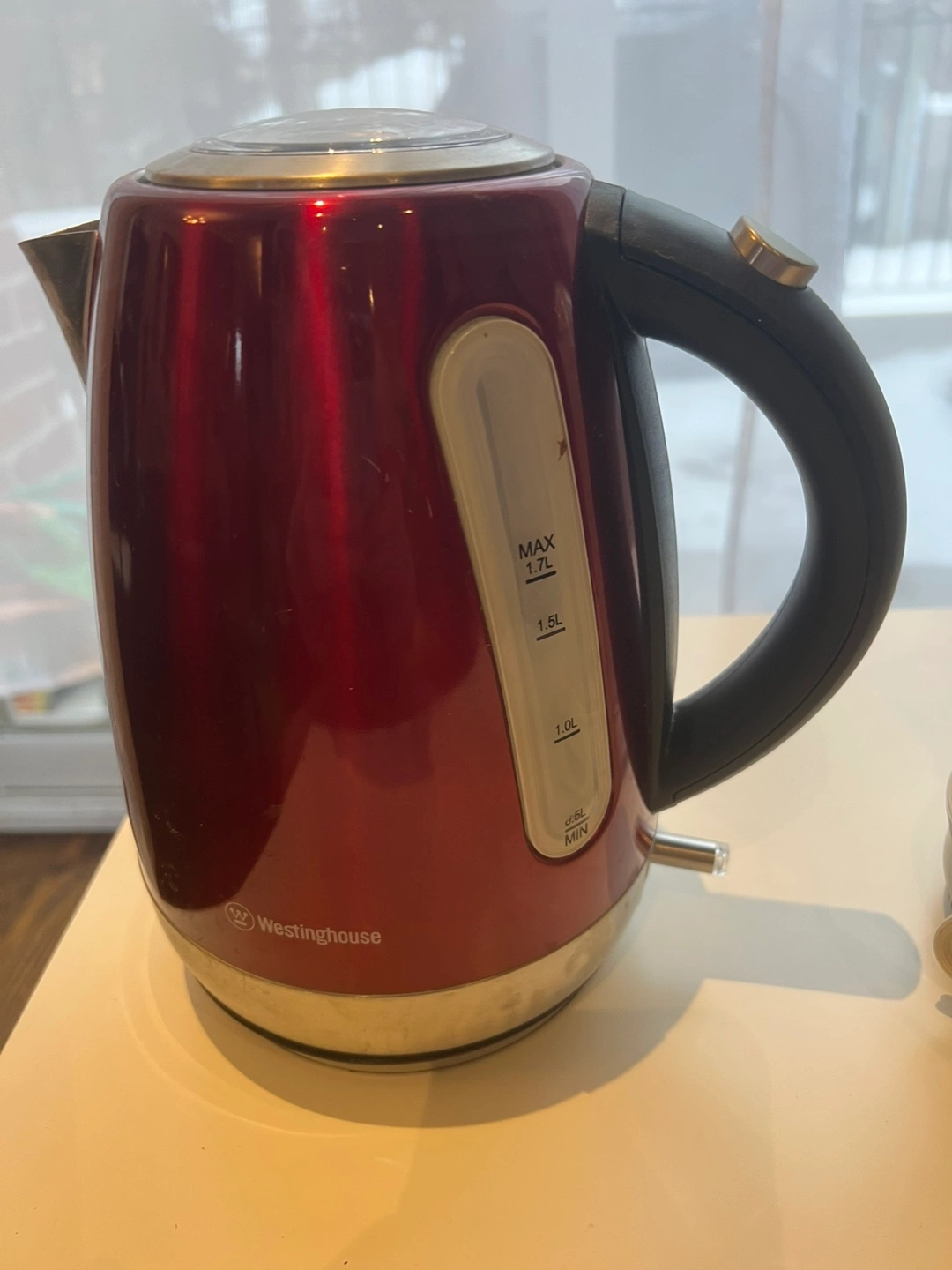 5Red electric kettle. 1.7L capacity. Stainless steel accents. Cordless.