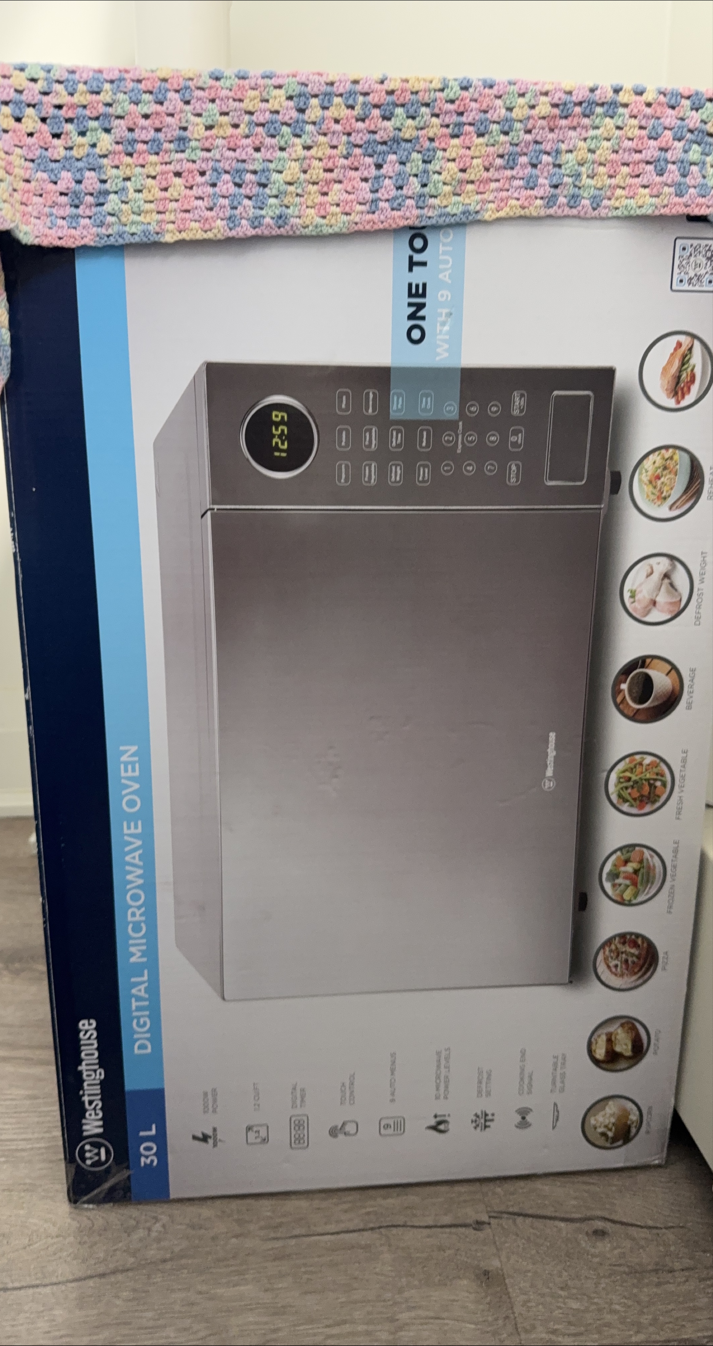 Selling a Westinghouse 30L digital microwave oven. It has a 1000W power output and a 1.2 cuft capacity. Features include touch controls, 9 auto menus, 10 microwave power levels, and a defrost setting. It also has a cooking end signal and a turntable glass tray