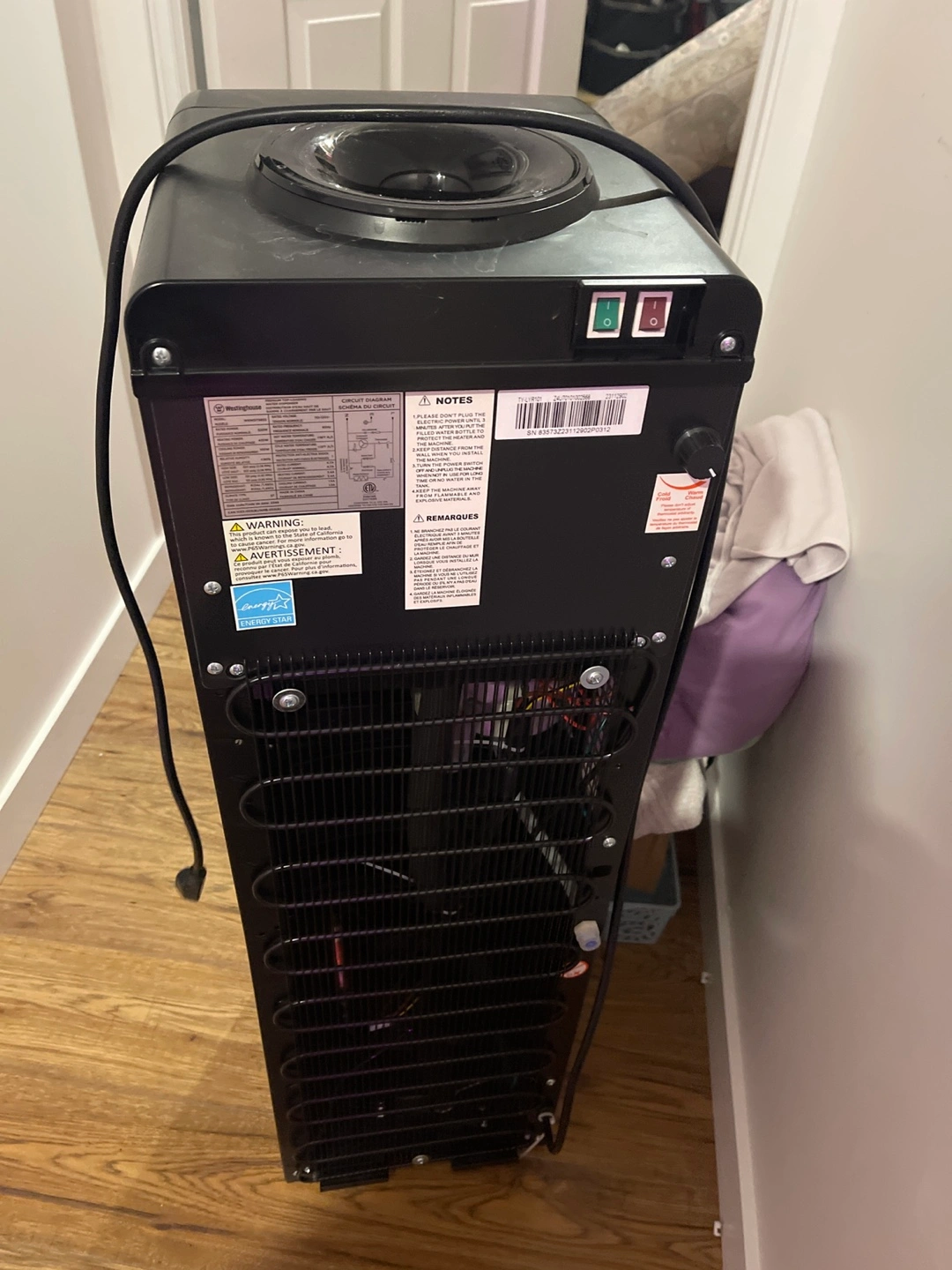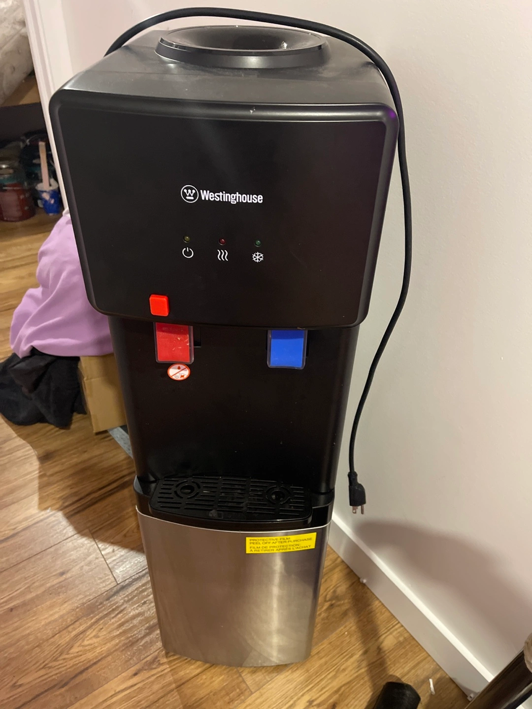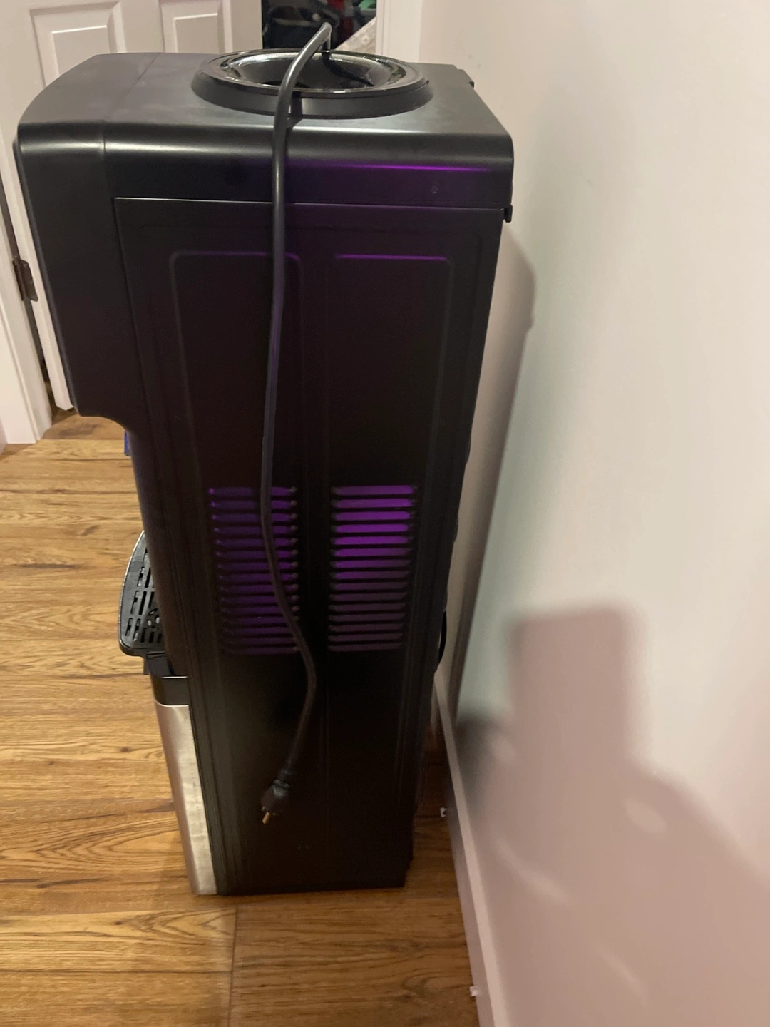 65Black and stainless steel water cooler. Top-loading design. Hot and cold water dispensing options. Power cord included. Used condition.