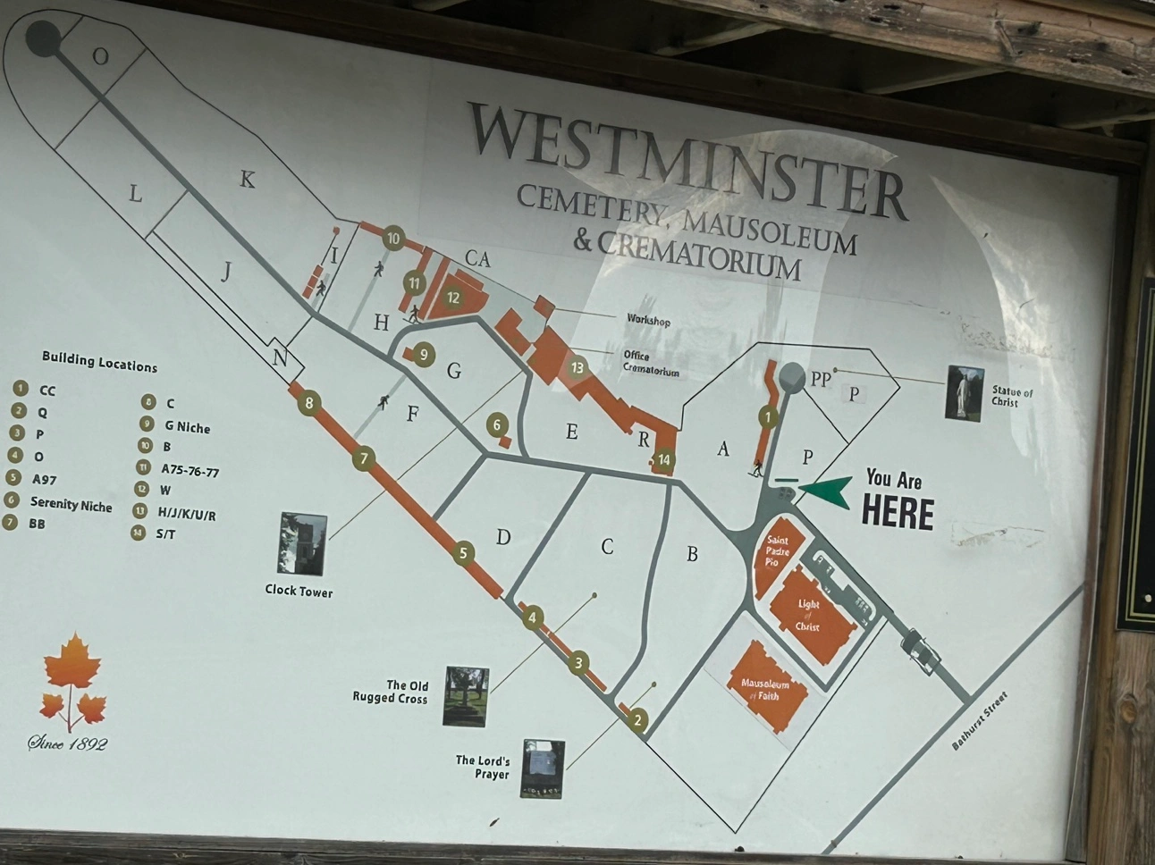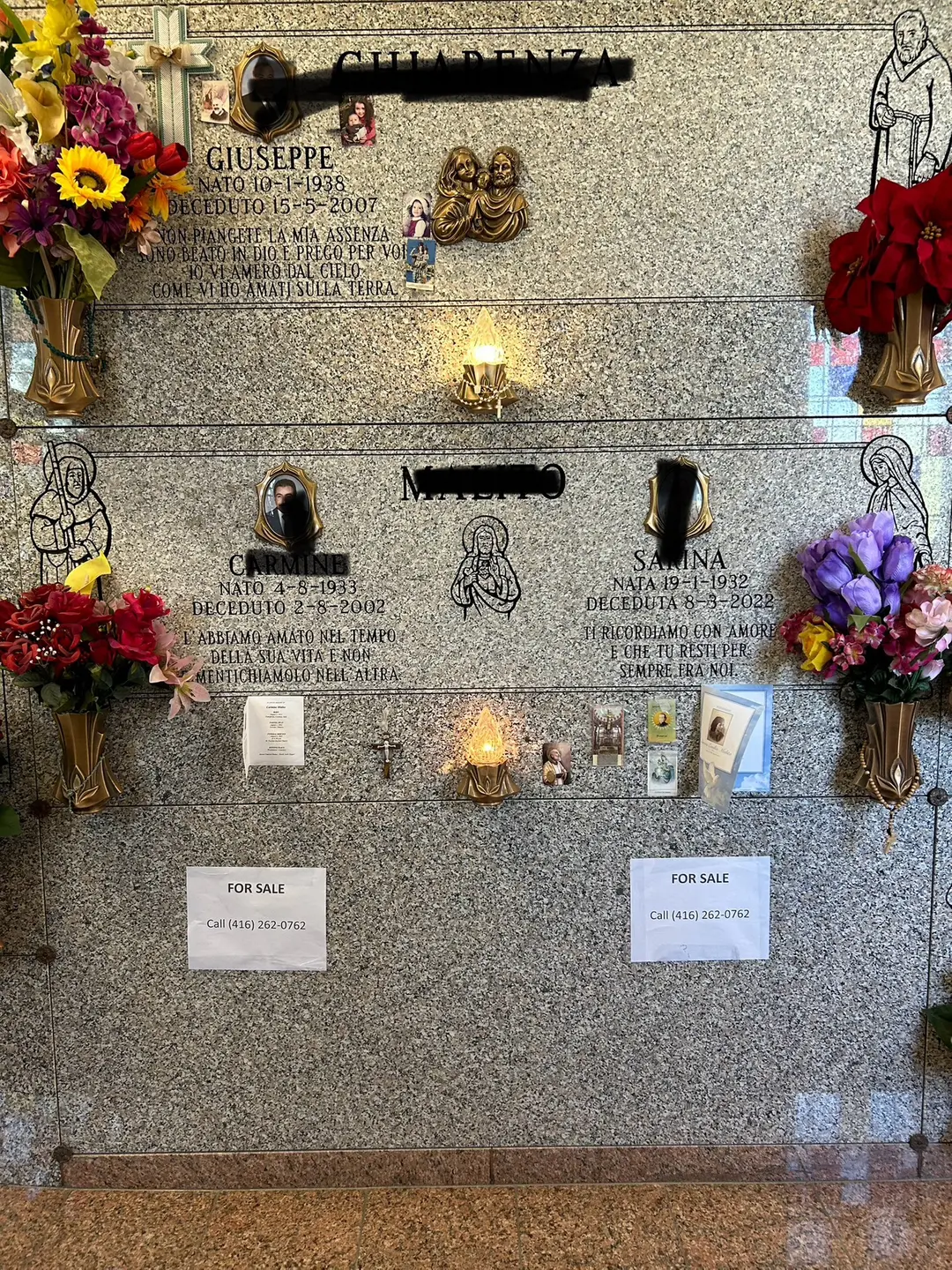284Location: 5830 Bathurst St., North York, ON Building C, INDOORS Upper Floor, Level A ( Bottom of 5,crypt levrels, closest to floor) #404/405 Accommodates 2 coffins side by side Includes both entombment fees, 2 inscriptions, 2 vases,, 2 frames for coloured pictures, 1 lamp, electricity, 2 licenses. Savings in the thousands as those additional fees/costs are already prepaid. Current market value price for crypt alone is $20,,700 + tax BEFORE adding additional cost entombment fees,, etc Payment and Transfer will be at: Westminster Cemetery Office, 5830 Bathurst Street, North York ON Please contact for more information.