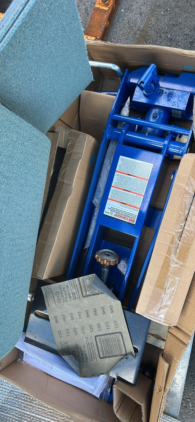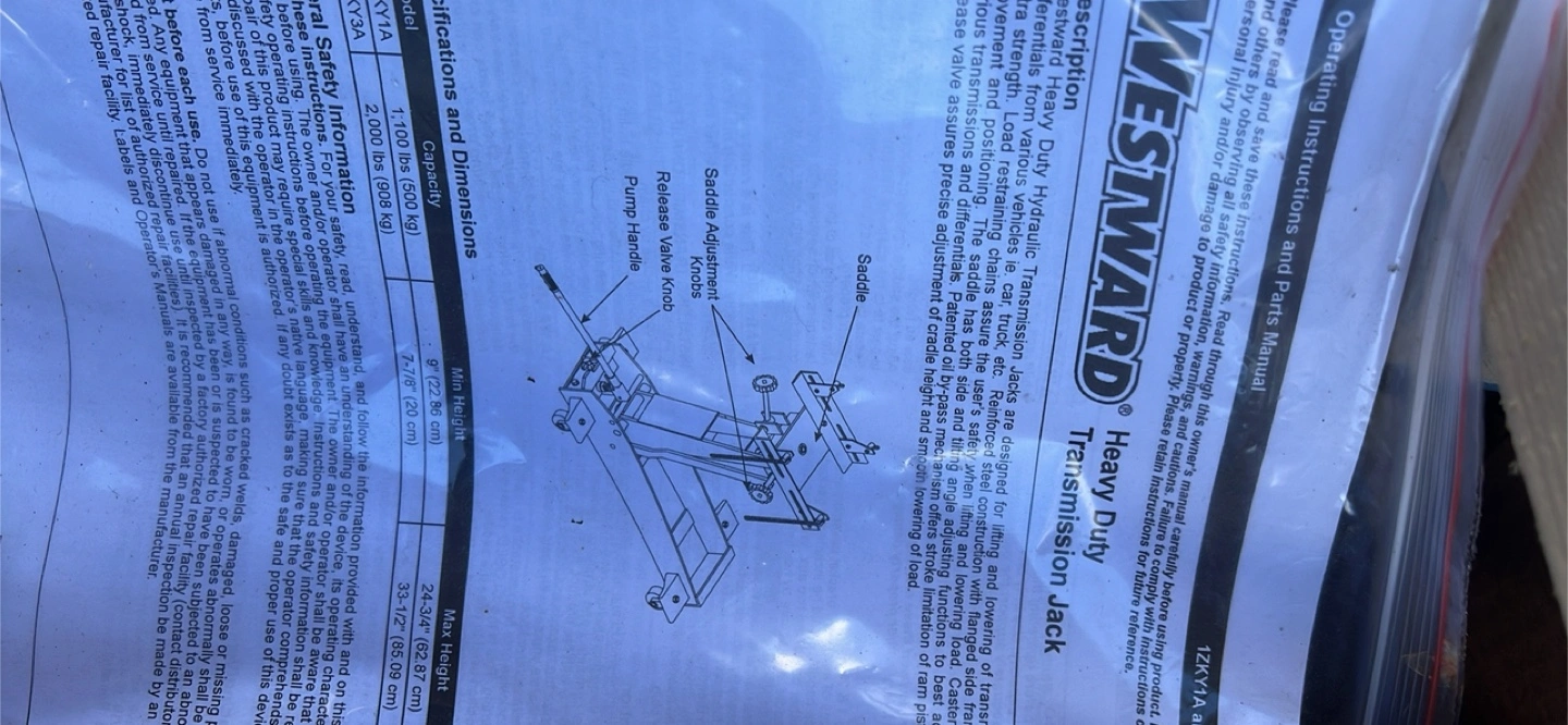 Selling a Westward heavy-duty transmission jack. The manual is included. It is designed for lifting and lowering transmissions from various vehicles, including cars, trucks, and SUVs. It has both side and top restraining chains. The saddle valve permits precise adjustment of table height and angle when lifting and lowering the load.