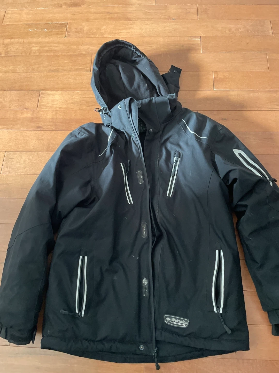23Selling a black Wetskins jacket in size M/M. The shell is made of 85% polyester and 15% polyurethane. The lining is 100% polyester