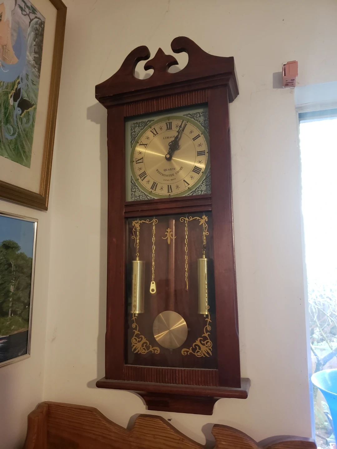 This is a Limage Westminster Chime pendulum clock. It's a quartz movement with a wooden case. Features two decorative weights and a pendulum.