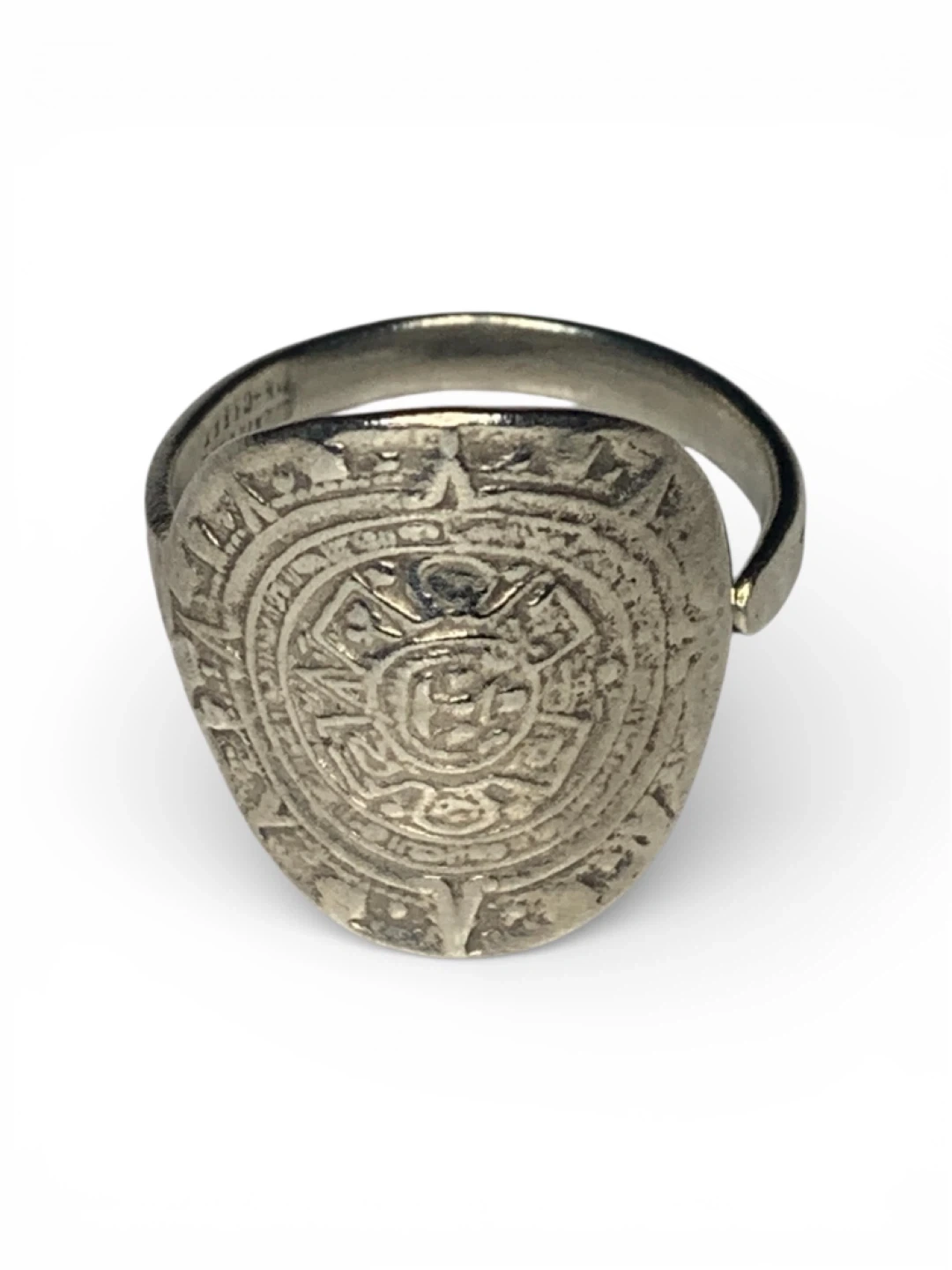 Sterling silver ring featuring an intricate Aztec Sun Stone design. Stamped 'MEXICO 925'. It's a unique piece with a rich cultural motif.