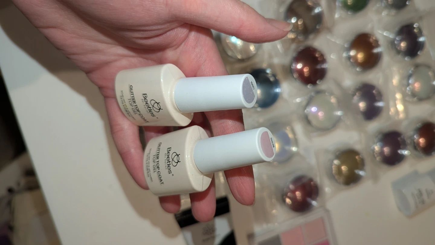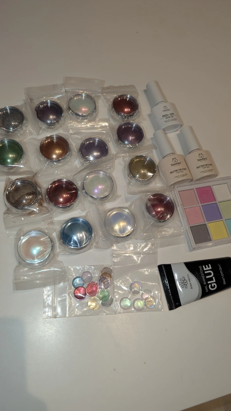 This kit includes a variety of nail art pigments, three bottles of Beetles gel top coat, and other accessories for creating unique nail designs. The pigments come in small containers and offer a range of colours with shimmery finishes.