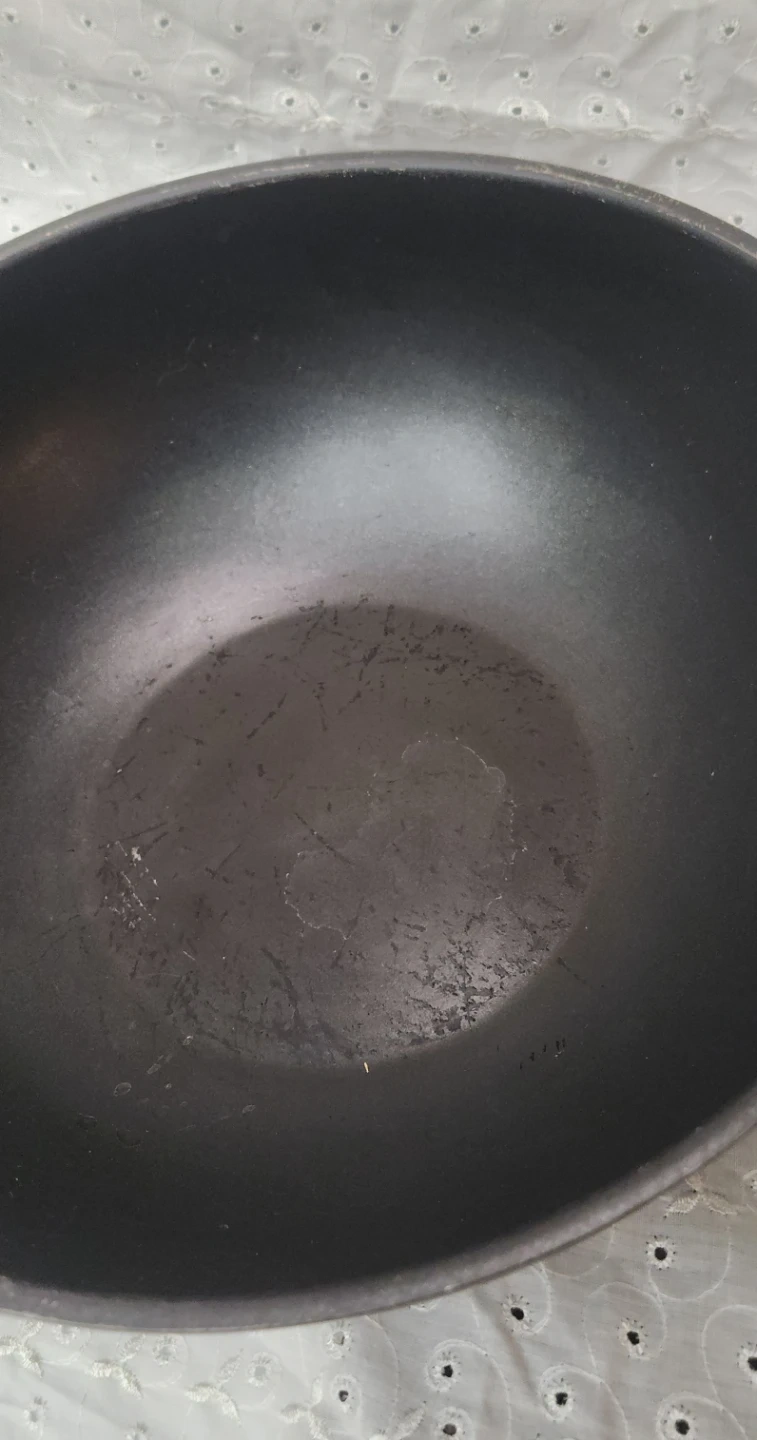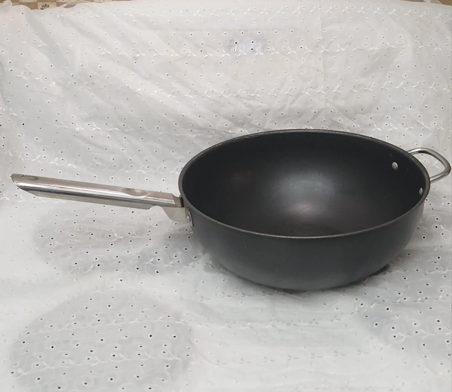 This is a wok pan with a long handle and a helper handle. It's black in colour and made from metal. Some minor scuffs are visible inside the pan.