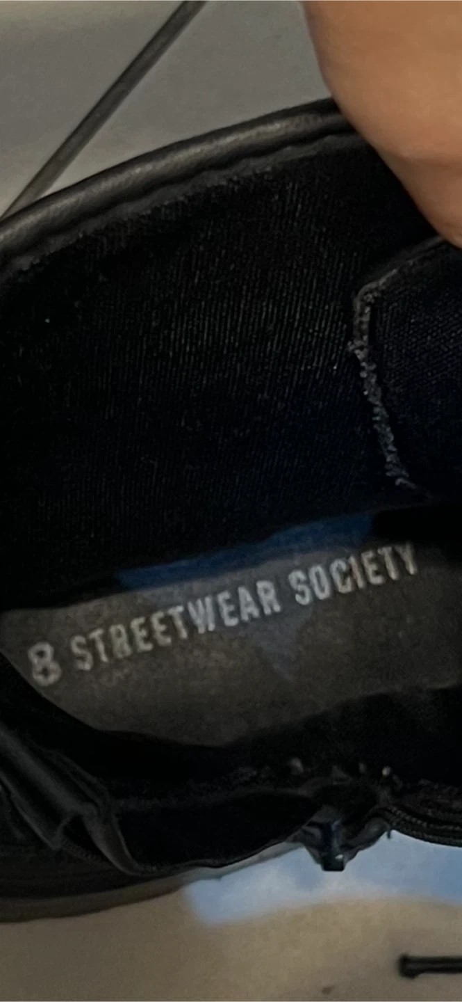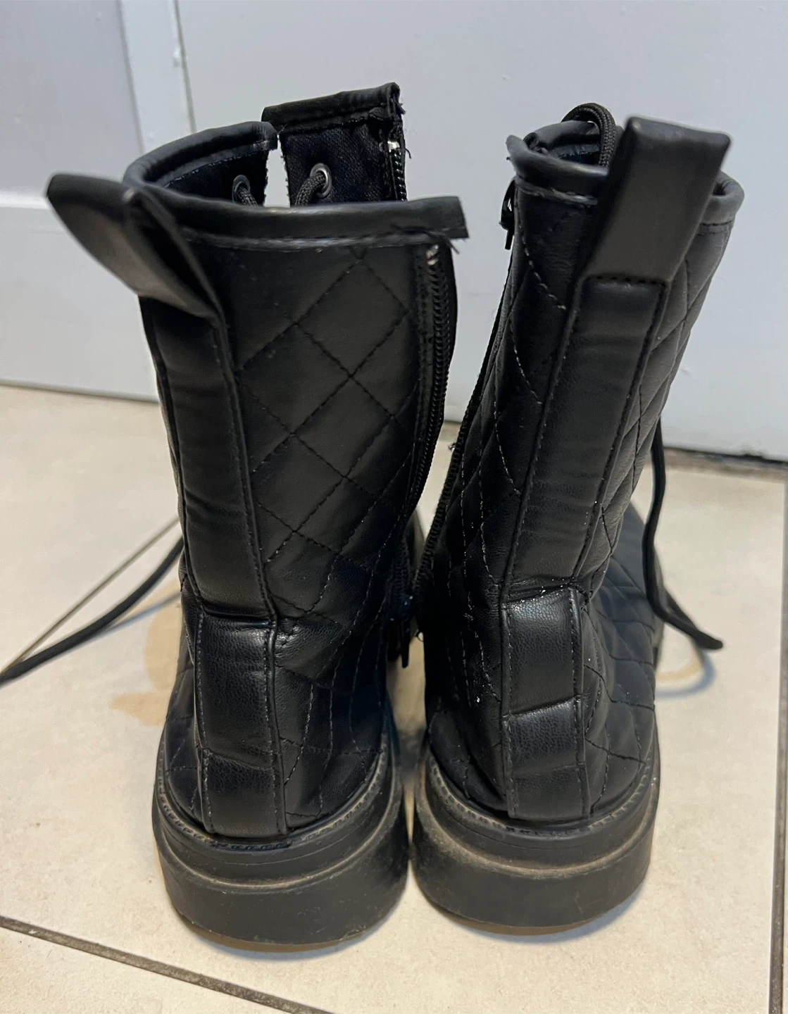 Black combat boots with a quilted pattern. They feature laces and a side zipper for easy on and off. Material appears to be faux leather. Size is 8.