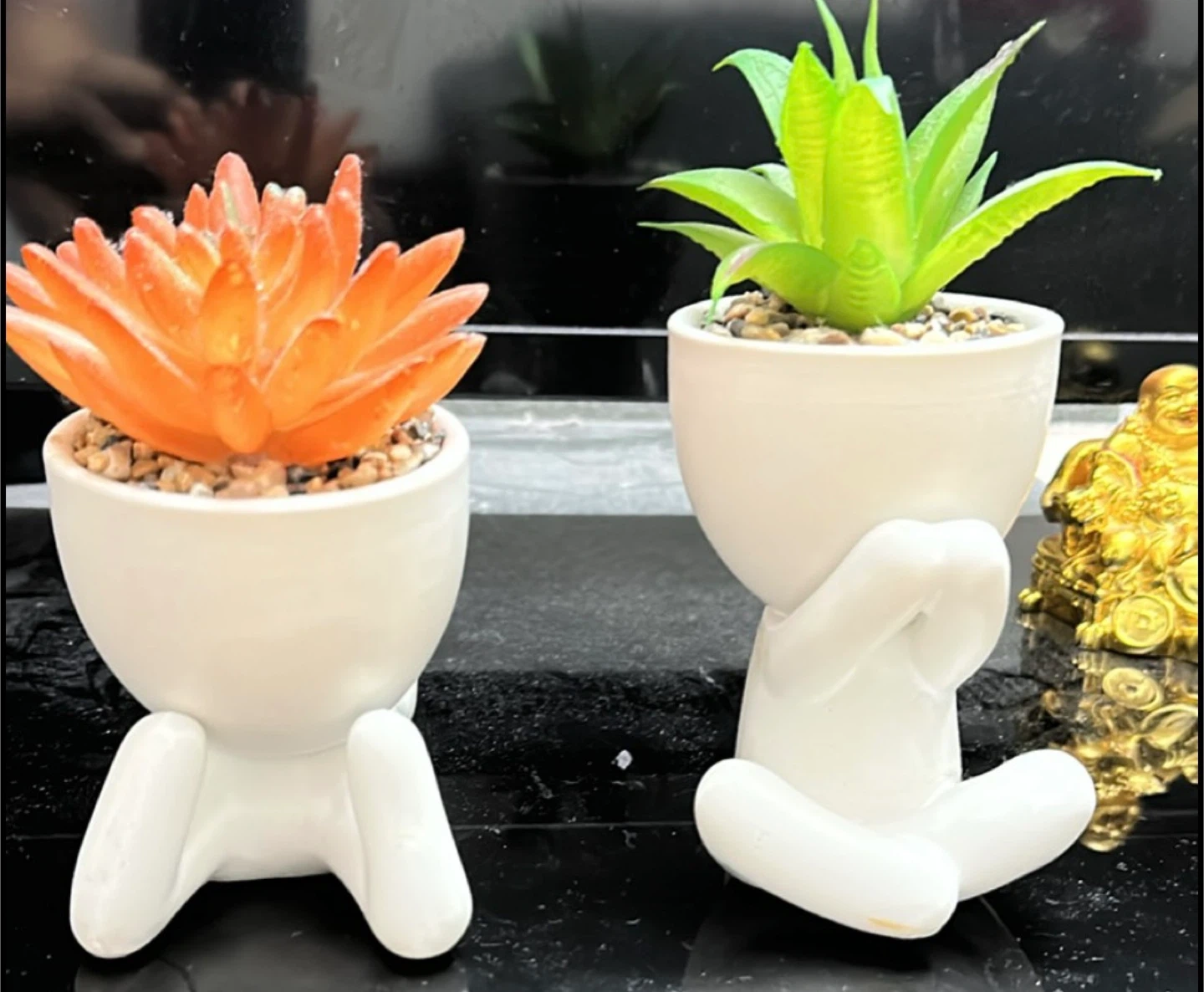 This set includes two cute ceramic planters, each holding a faux succulent. The planters have a unique design with little figures sitting cross-legged. Perfect for adding a bit of green to any small space!
