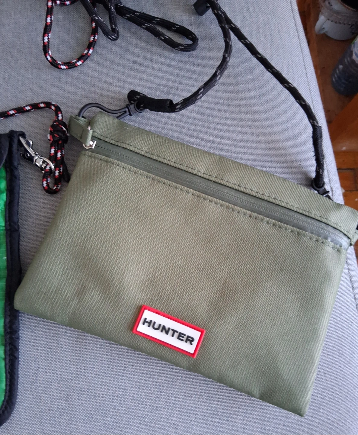 Hunter nylon crossbody pouches. One green and one khaki. Features adjustable straps for comfortable wear. Great for keeping essentials organized on the go!
