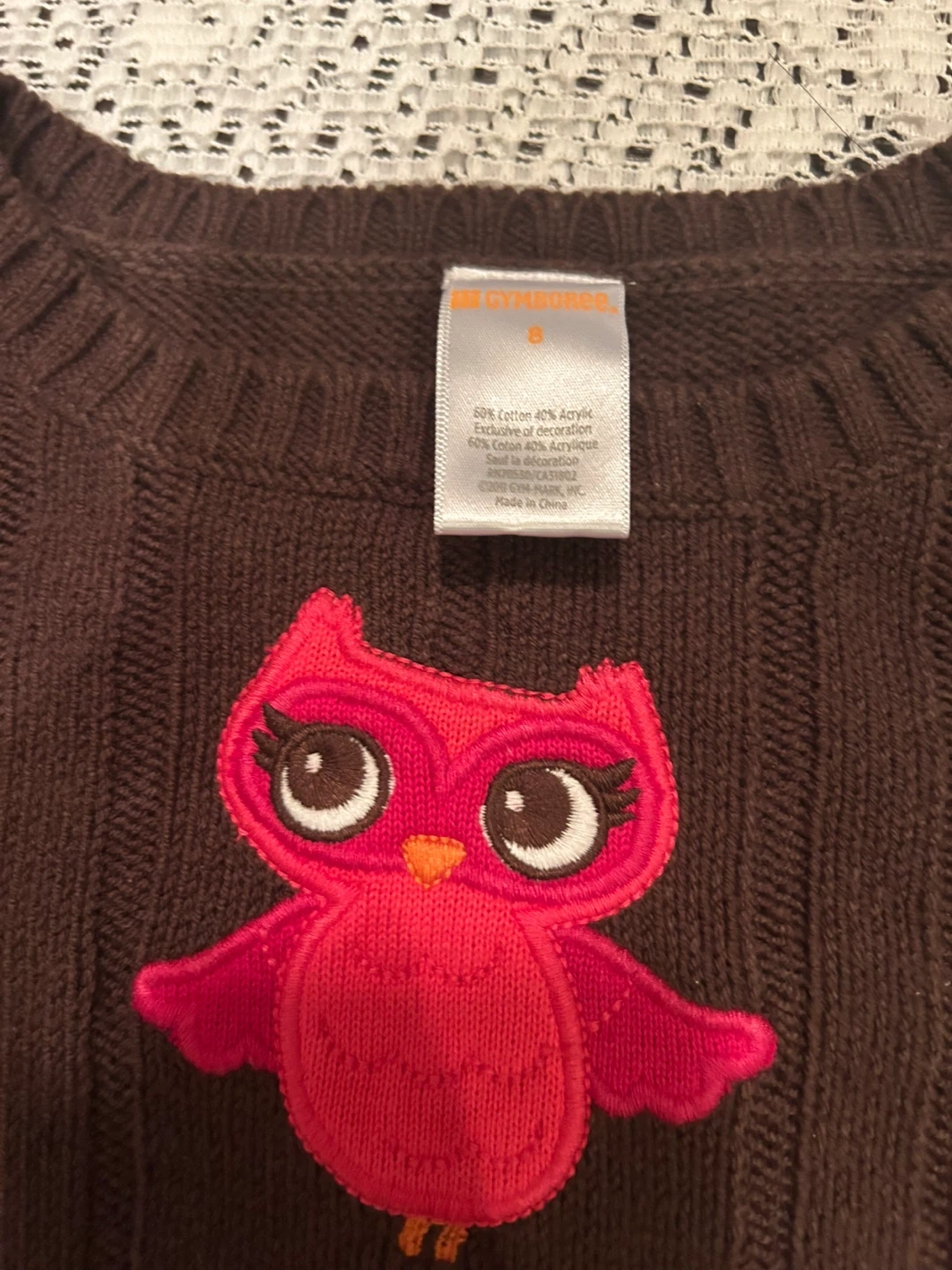 This Gymboree sweater dress is brown with a cute pink owl applique on the front. It features colorful striped detail at the hem. The dress is made from 60% cotton and 40% acrylic