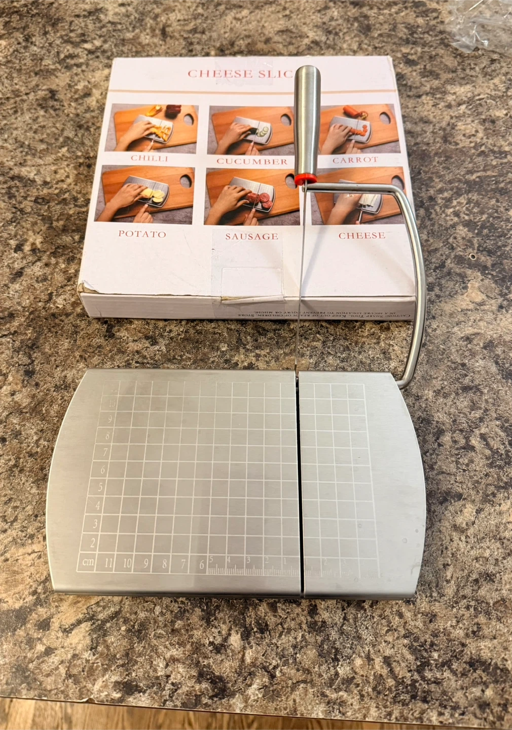 This cheese slicer is made of durable stainless steel. It has a wire cutting blade and a handle for easy use. The base features grid markings for consistent slicing. It's great for slicing cheese, potatoes, and other firm foods!