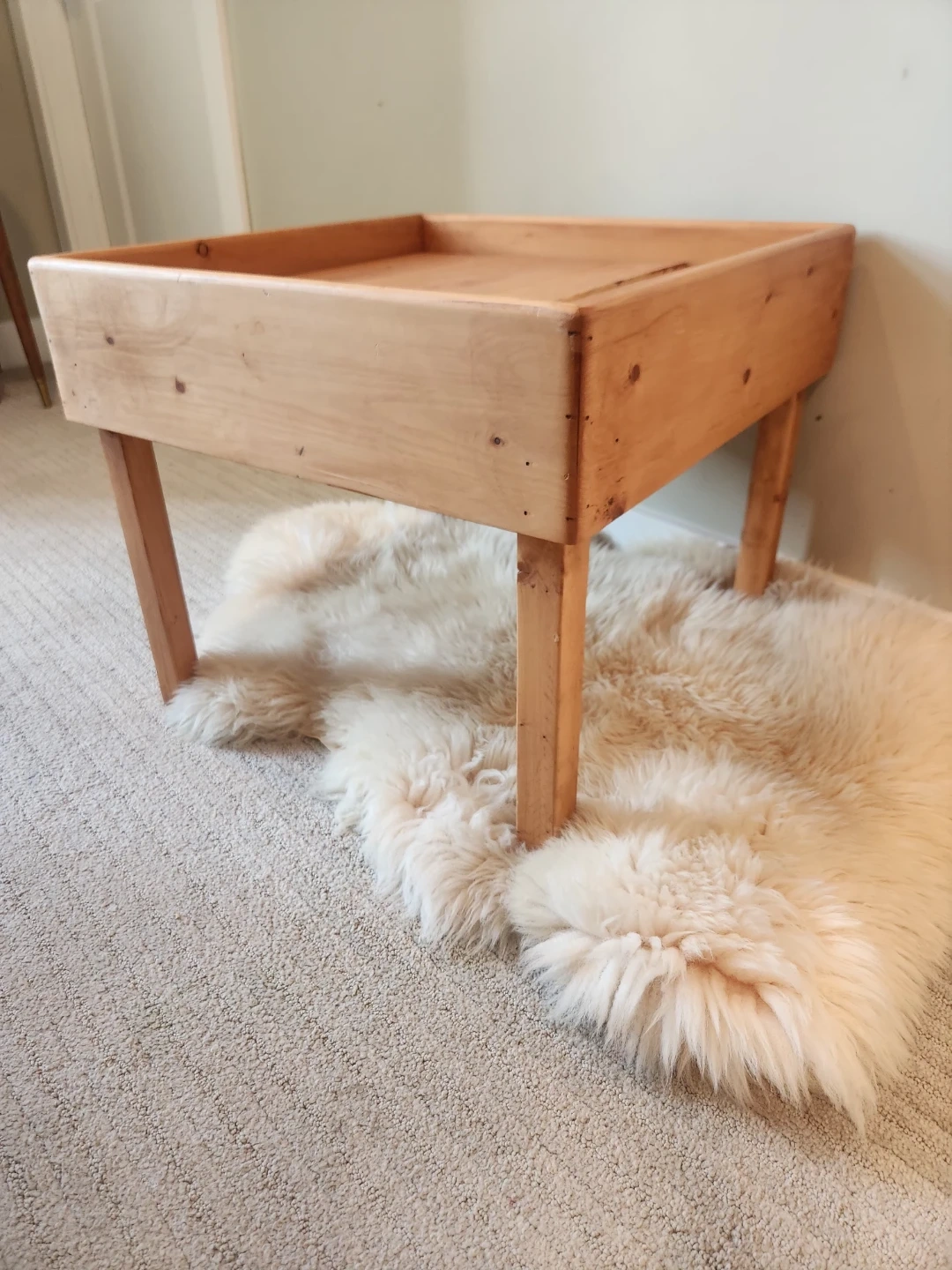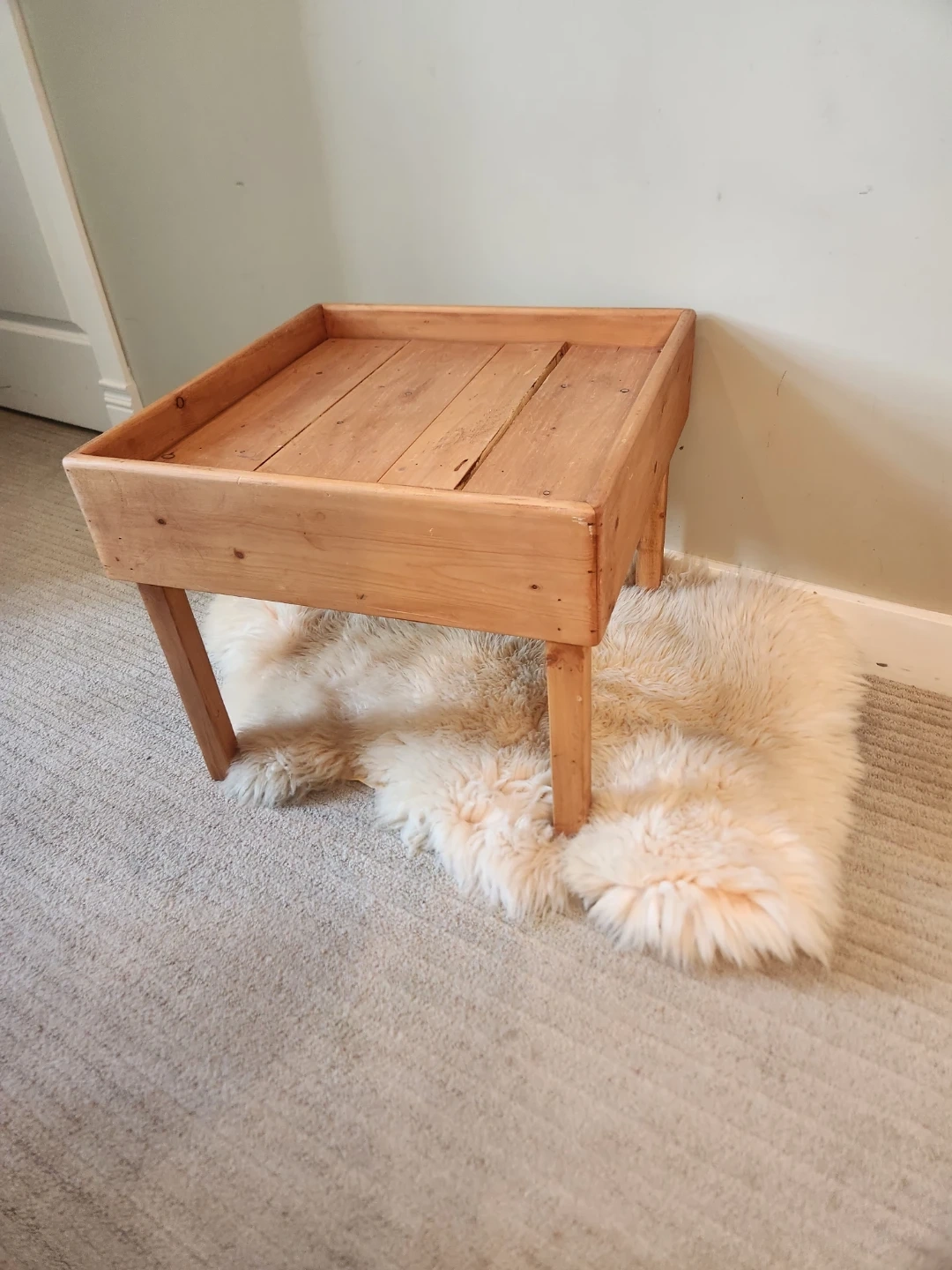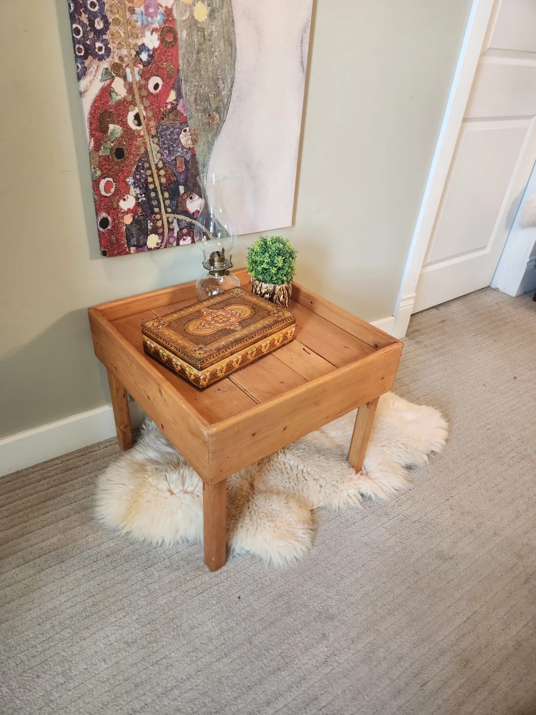 This wooden tray table is perfect for holding books, drinks, or decorative items. It's made of natural wood, its super sturdy and features a unique tray design. It would be a great addition to a living room or bedroom! Matches macreme, pottery, plants and cabin decor. Surface is 21x21 inches and 18 inches high.