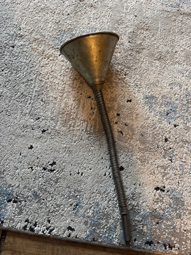 This is a used steel funnel with a flexible hose, perfect for those hard-to-reach fill points. The funnel shows signs of wear, which you can see in the photos, but is still fully functional. Cash accepted.