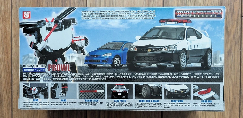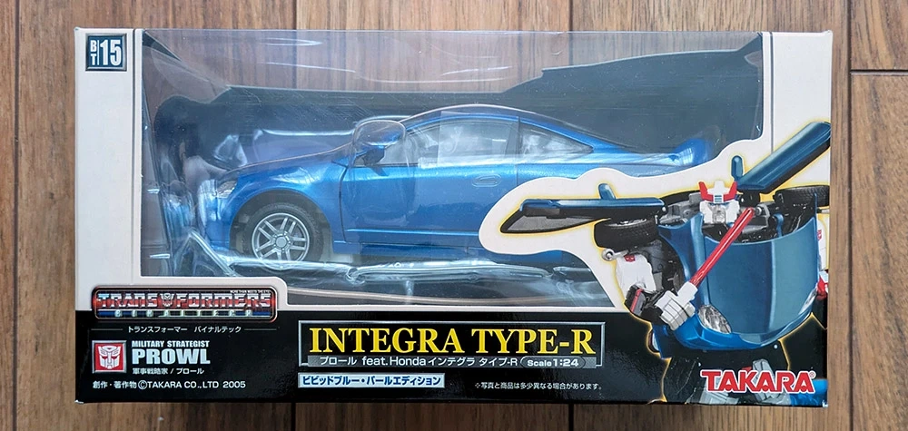 "Prowl", BT-15, from the Transformers Binaltech line, brand new, factory sealed. Modelled after a blue Honda Integra Type-R in 1:24 scale.