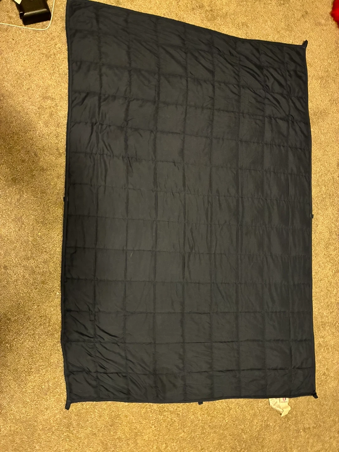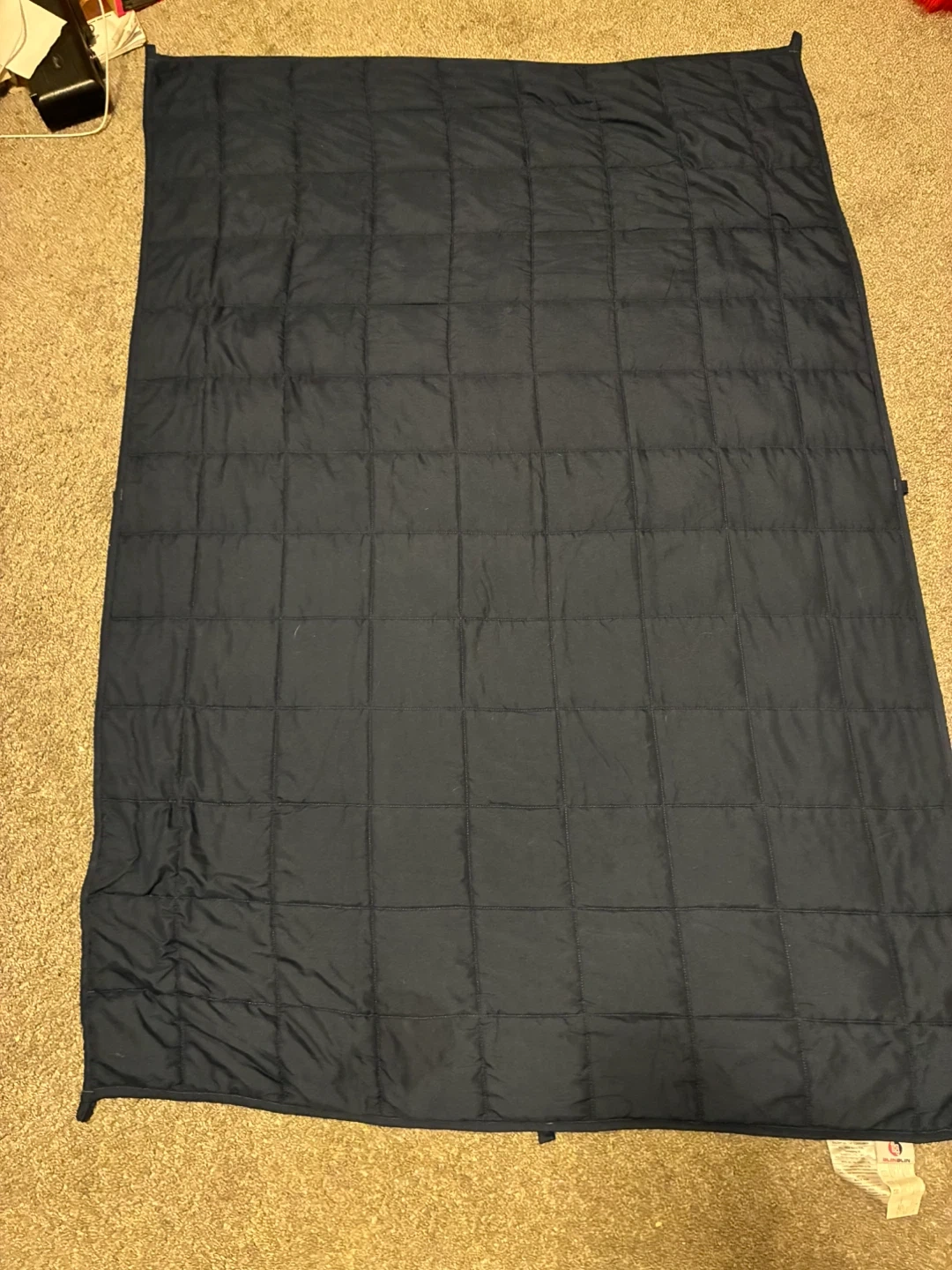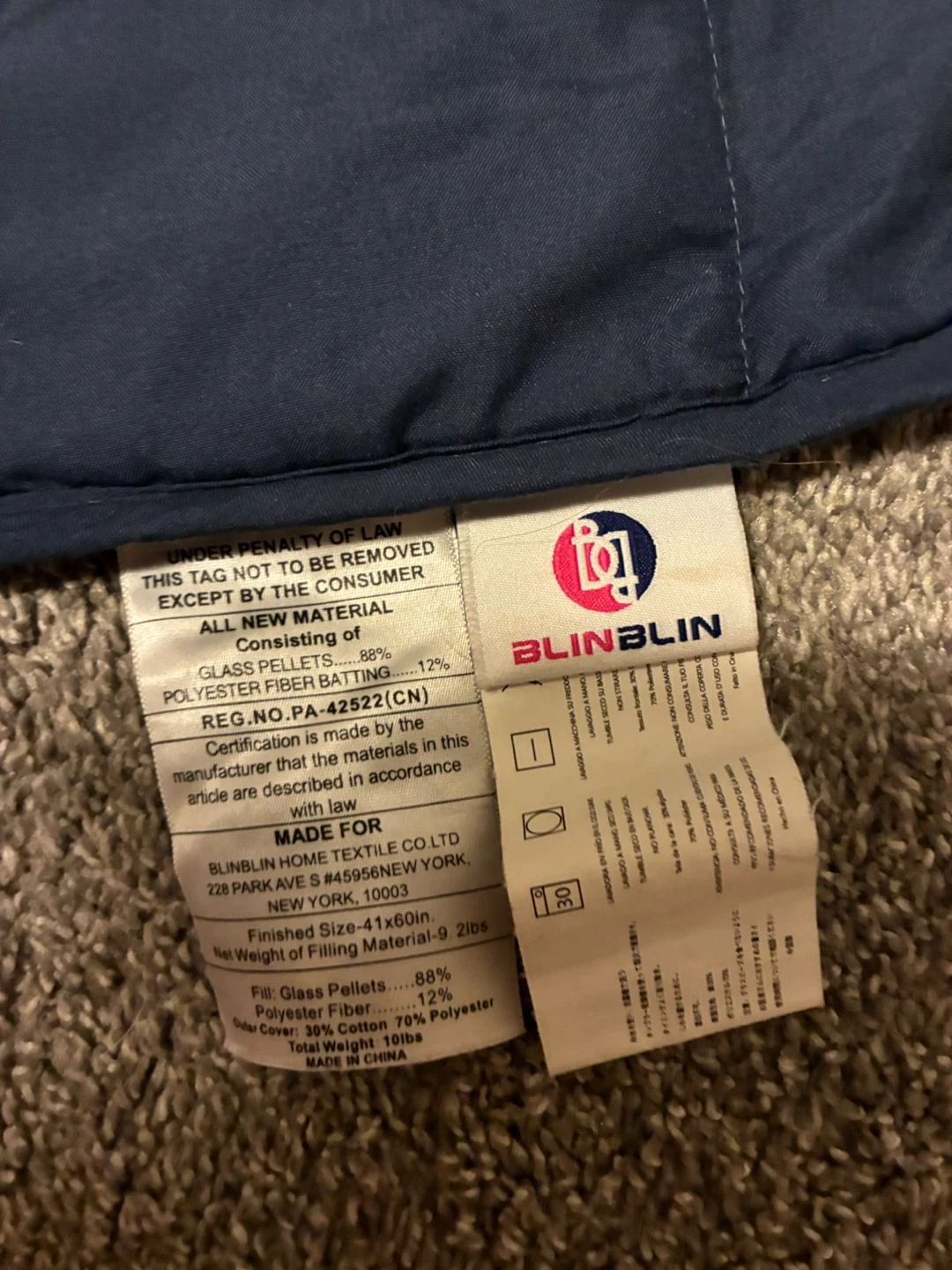 This BlinBlin weighted blanket is filled with glass pellets and polyester fiber batting. It's finished at 41x60 inches and weighs 10lbs with a net weight of 9.2lbs. Made for BlinBlin Home Textile Co. Ltd. in New York.