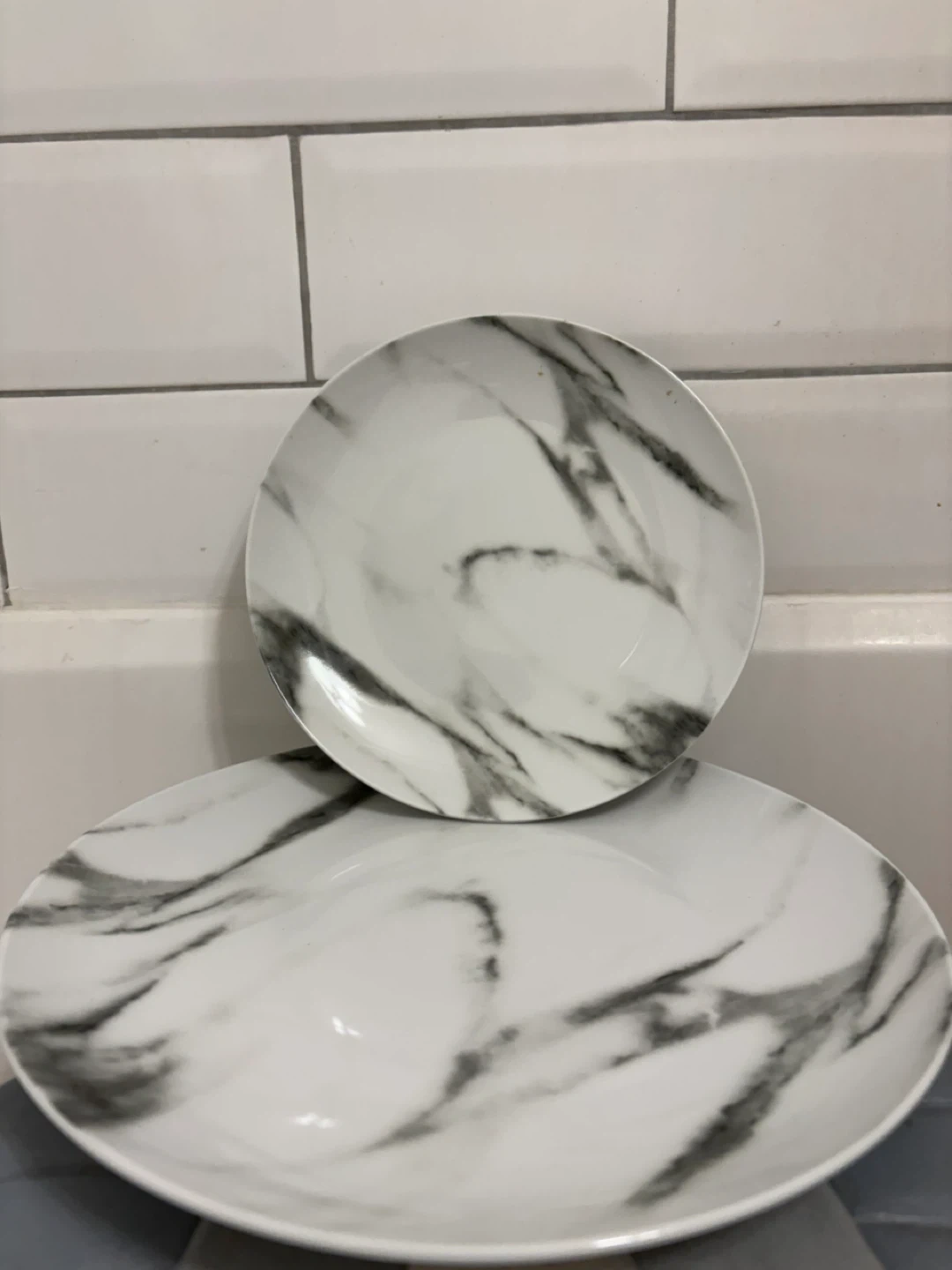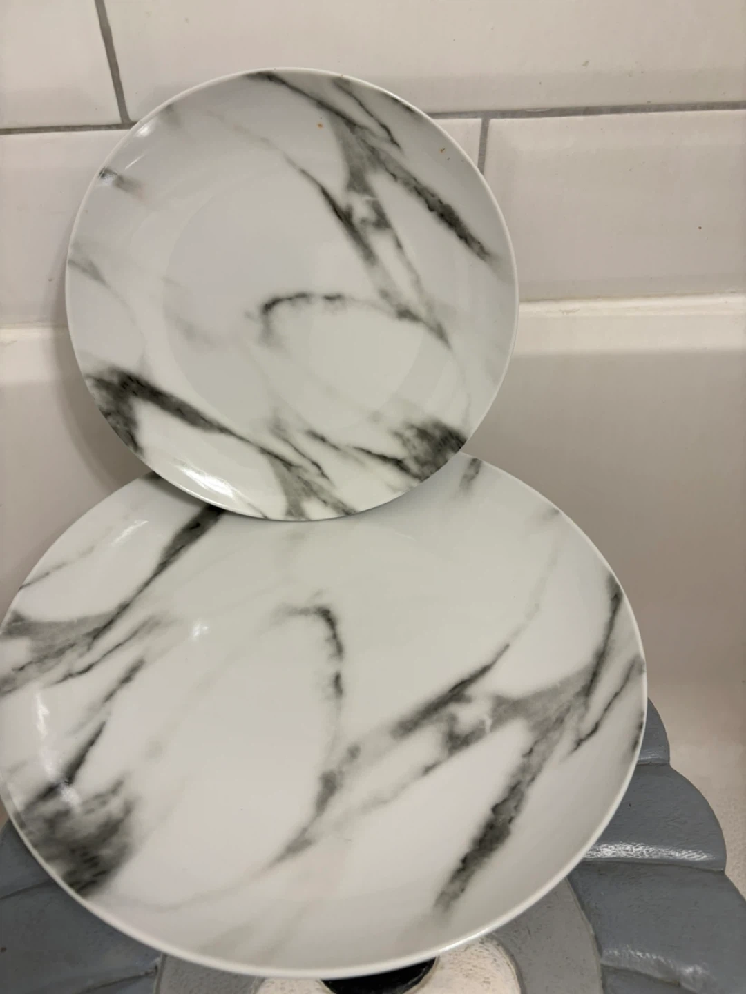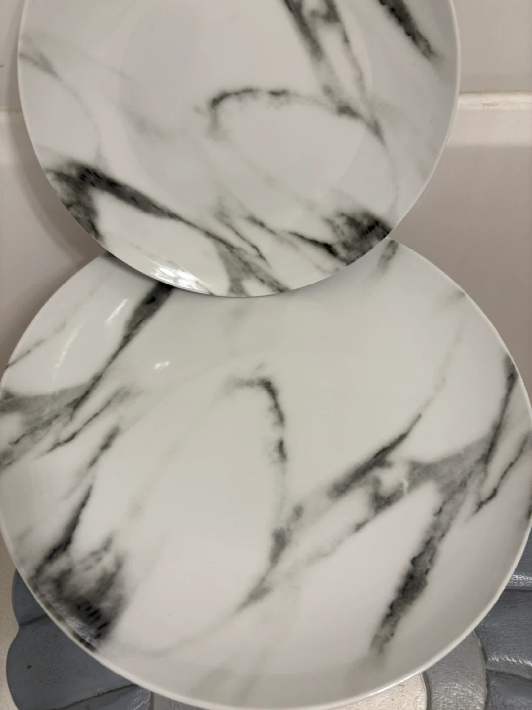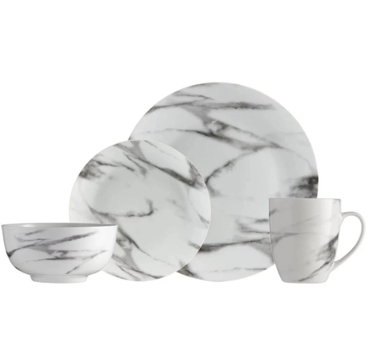 Four-piece dinnerware set with a stylish marble print. Includes plates, a bowl, and a mug. Made from durable ceramic material.