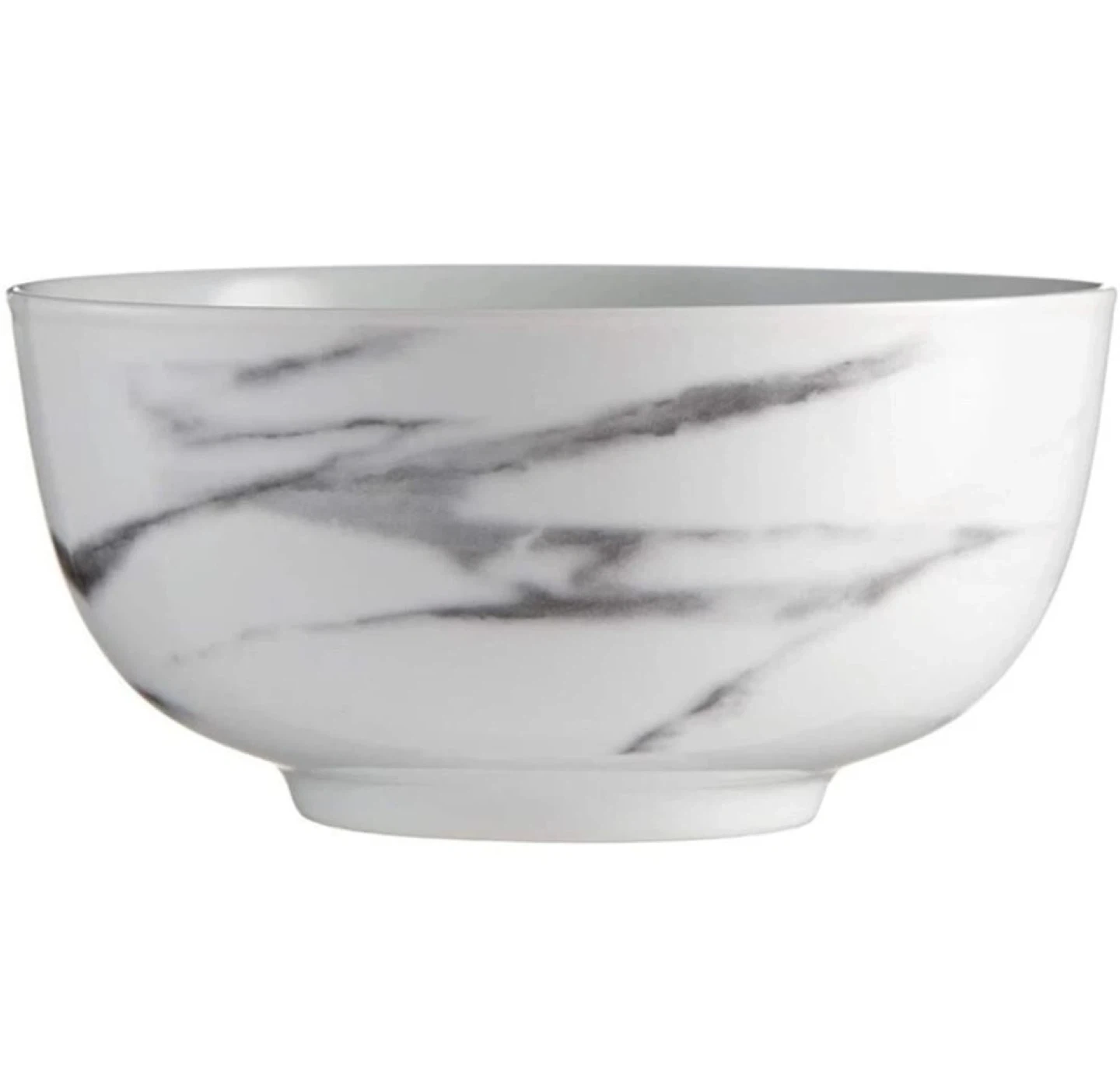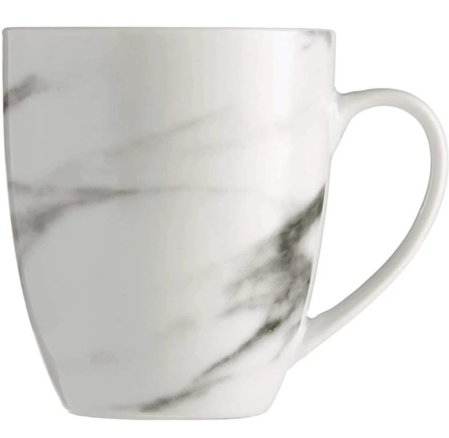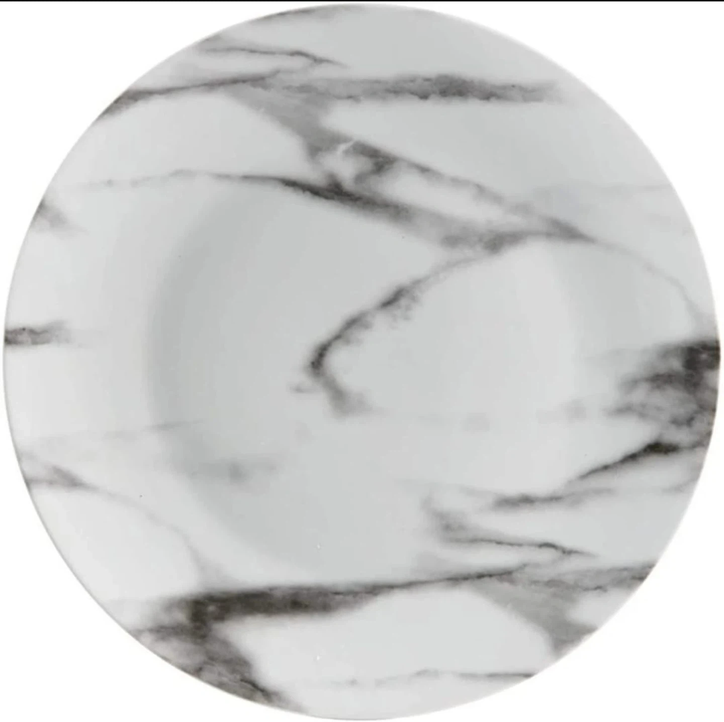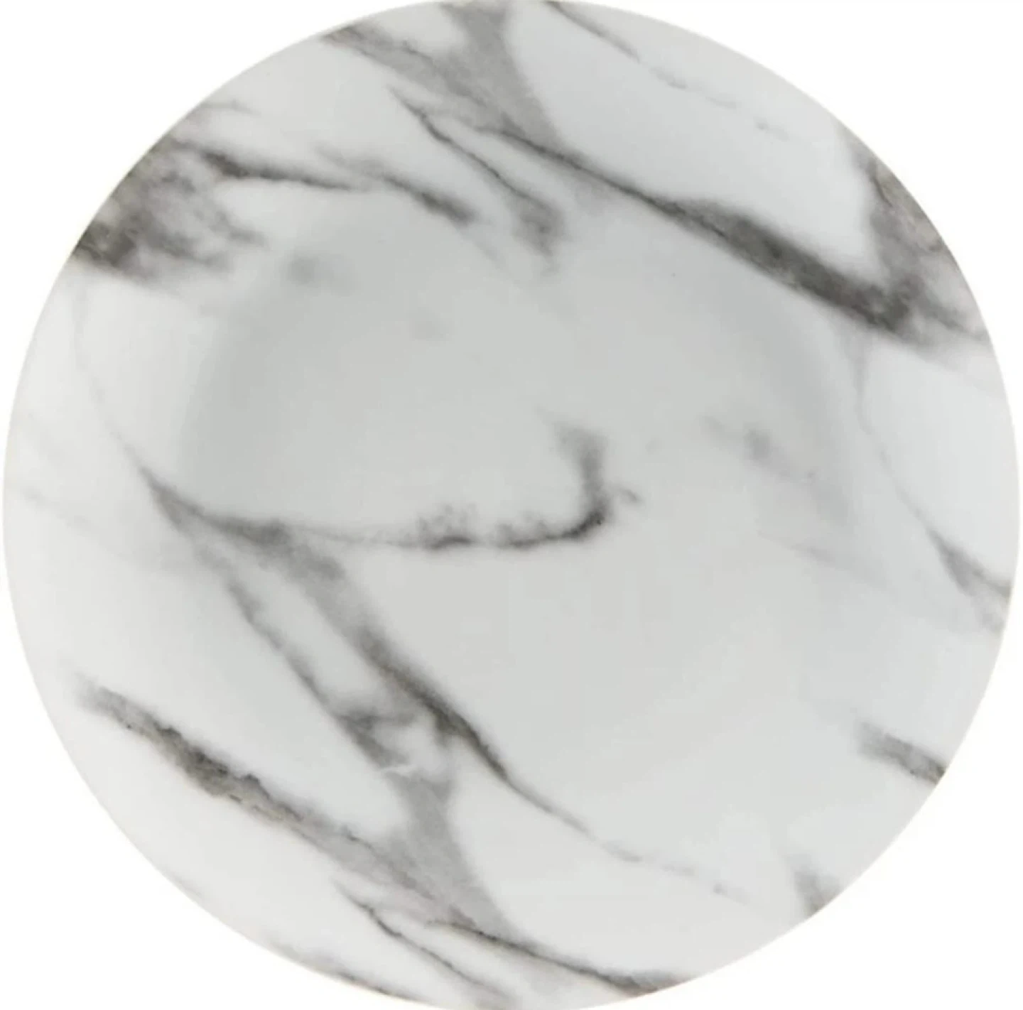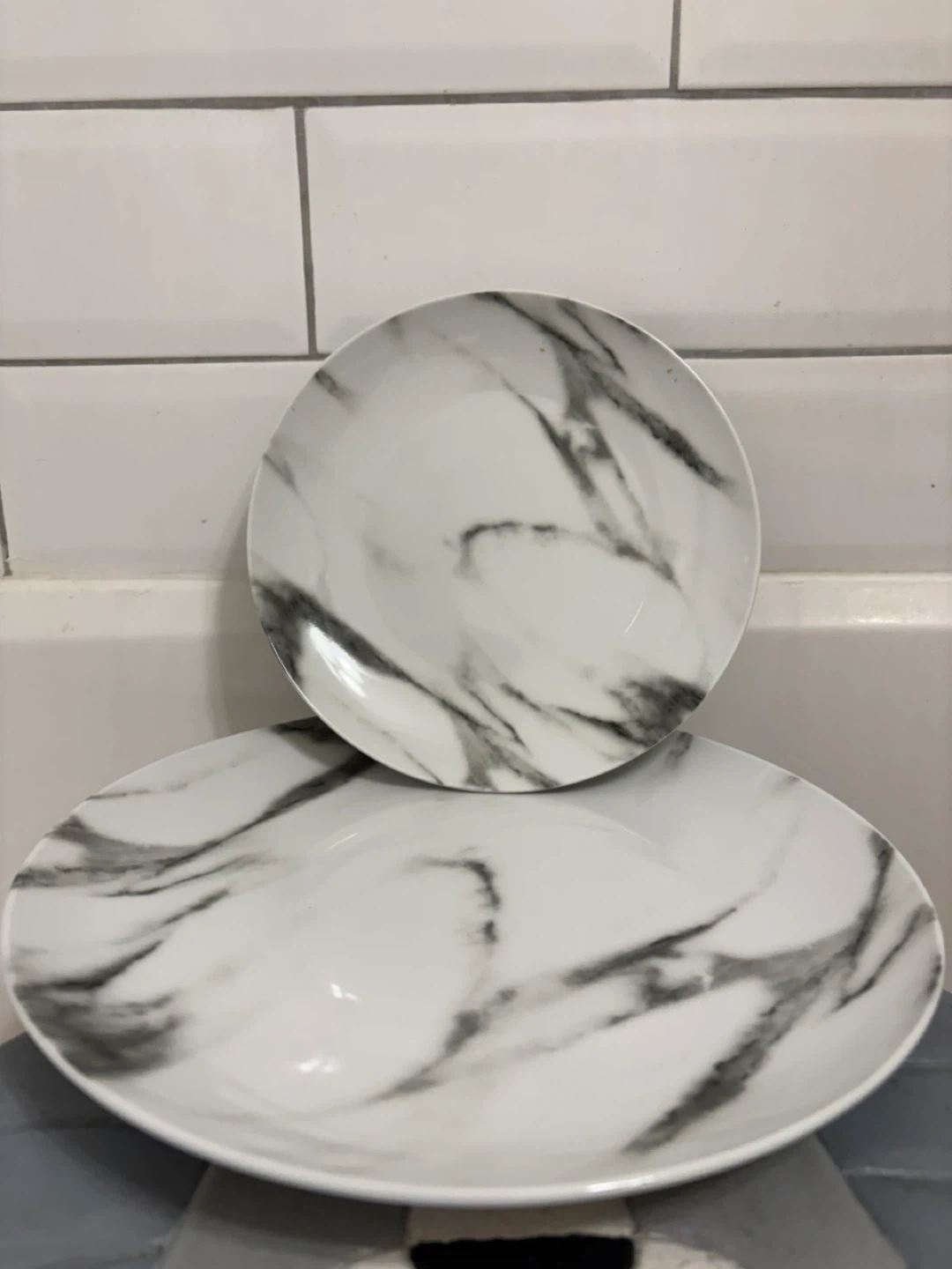 Four-piece dinnerware set with a stylish marble print. Includes plates, a bowl, and a mug. Made from durable ceramic material.