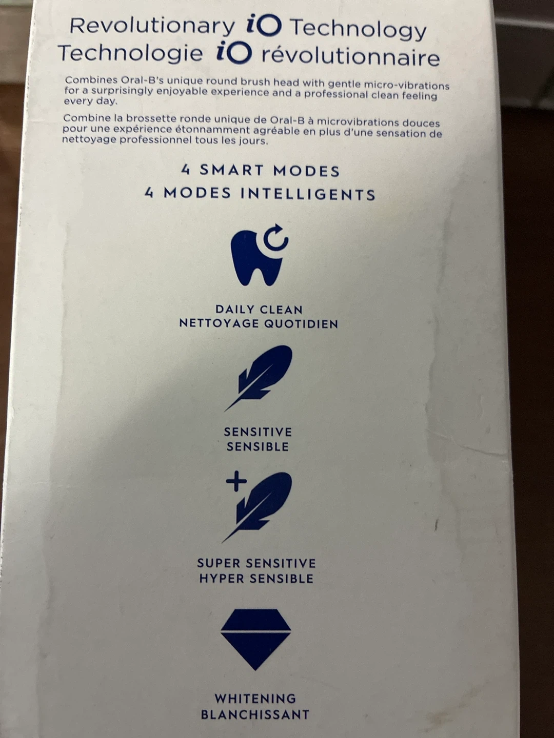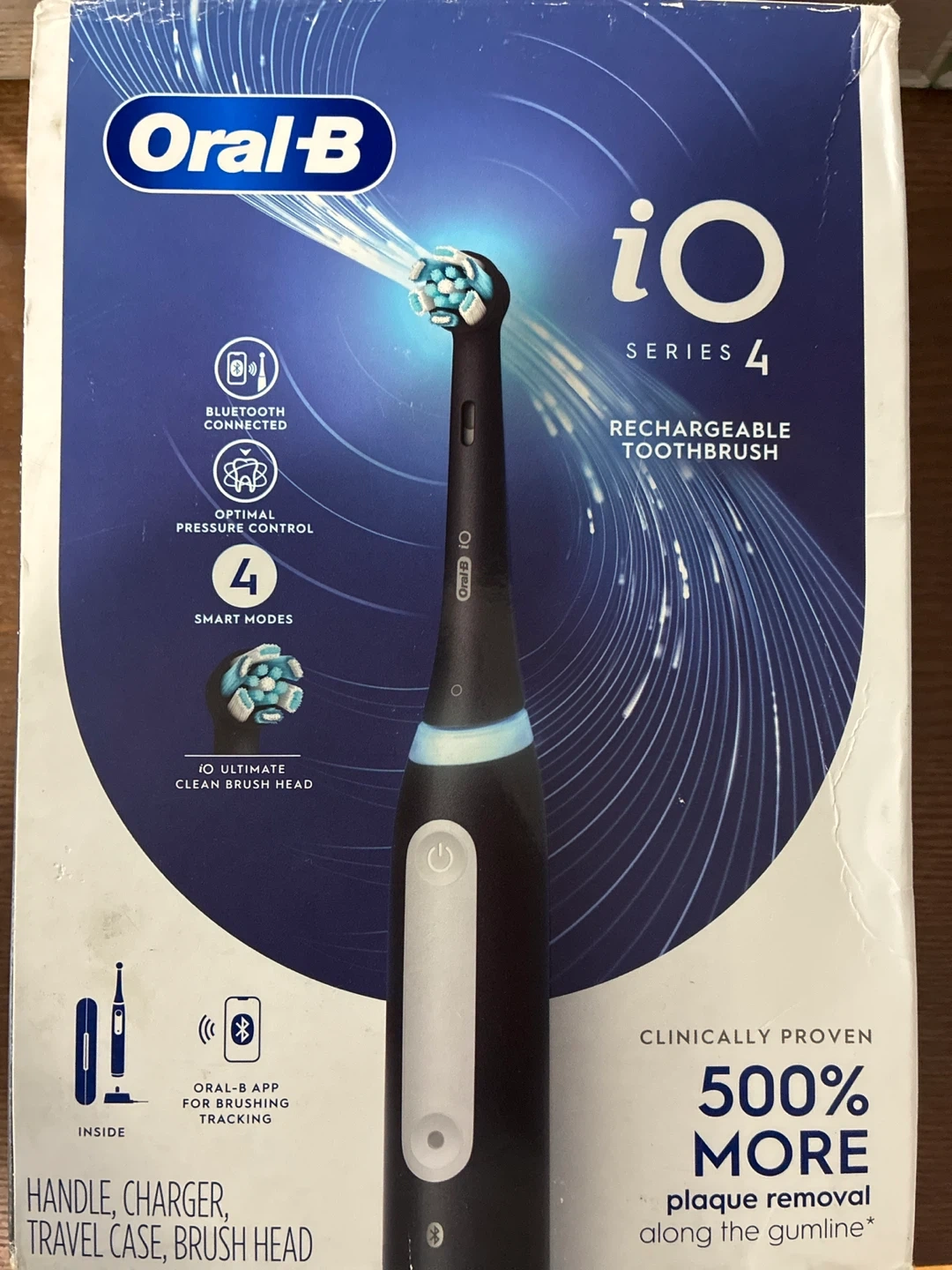 Experience revolutionary iO technology with this Oral-B rechargeable toothbrush. It features Bluetooth connectivity, optimal pressure control, and 4 smart modes: Daily Clean, Sensitive, Super Sensitive, and Whitening. This electric toothbrush comes in a sleek matte black finish and includes a handle, charger, travel case, and brush head.