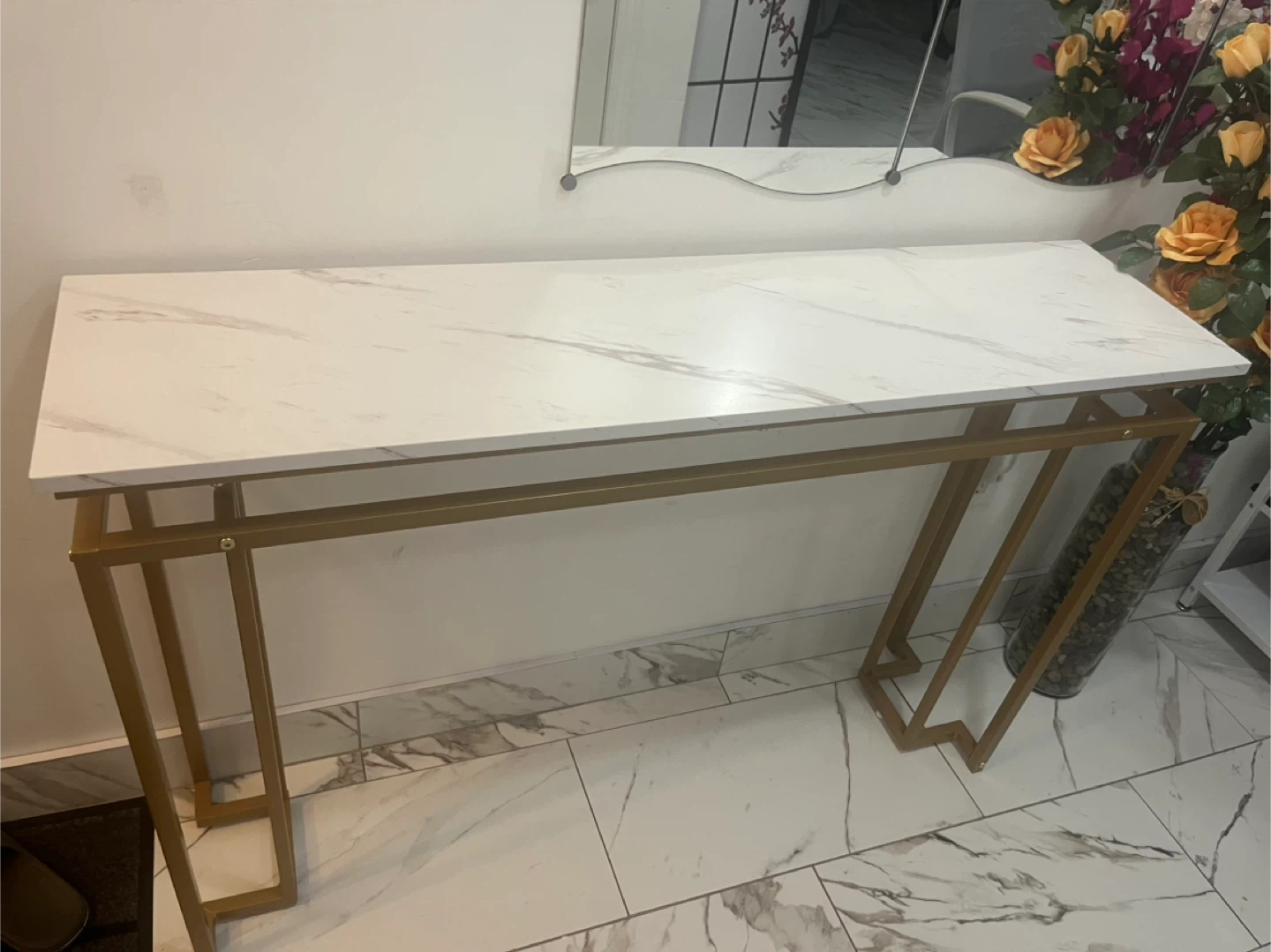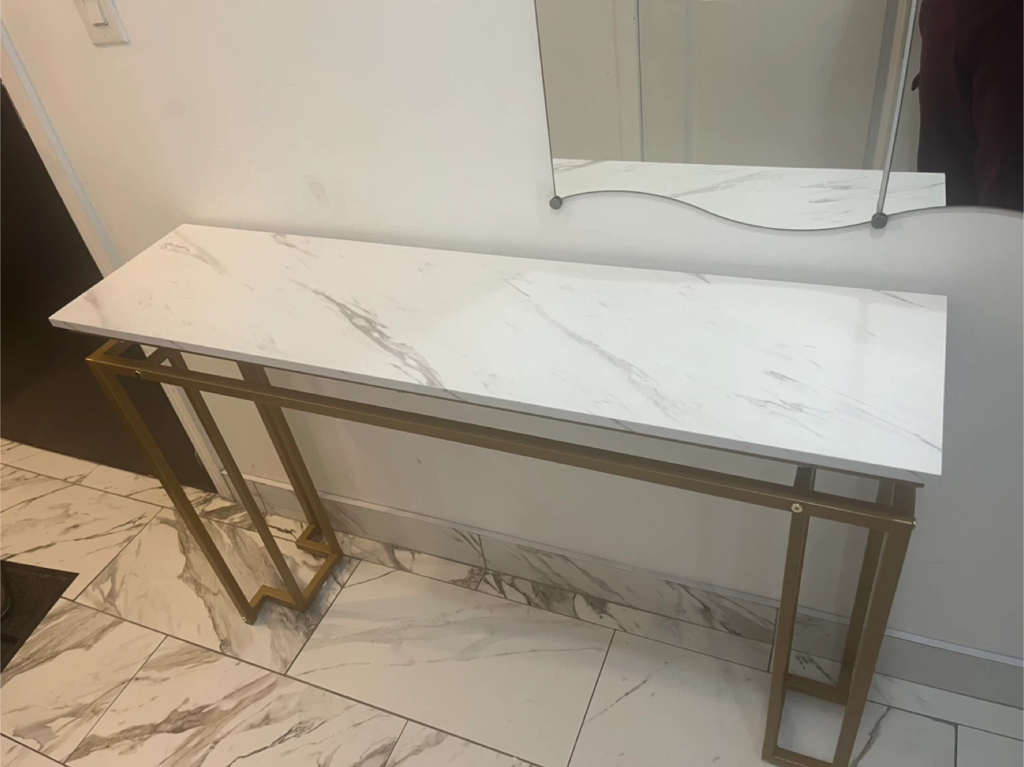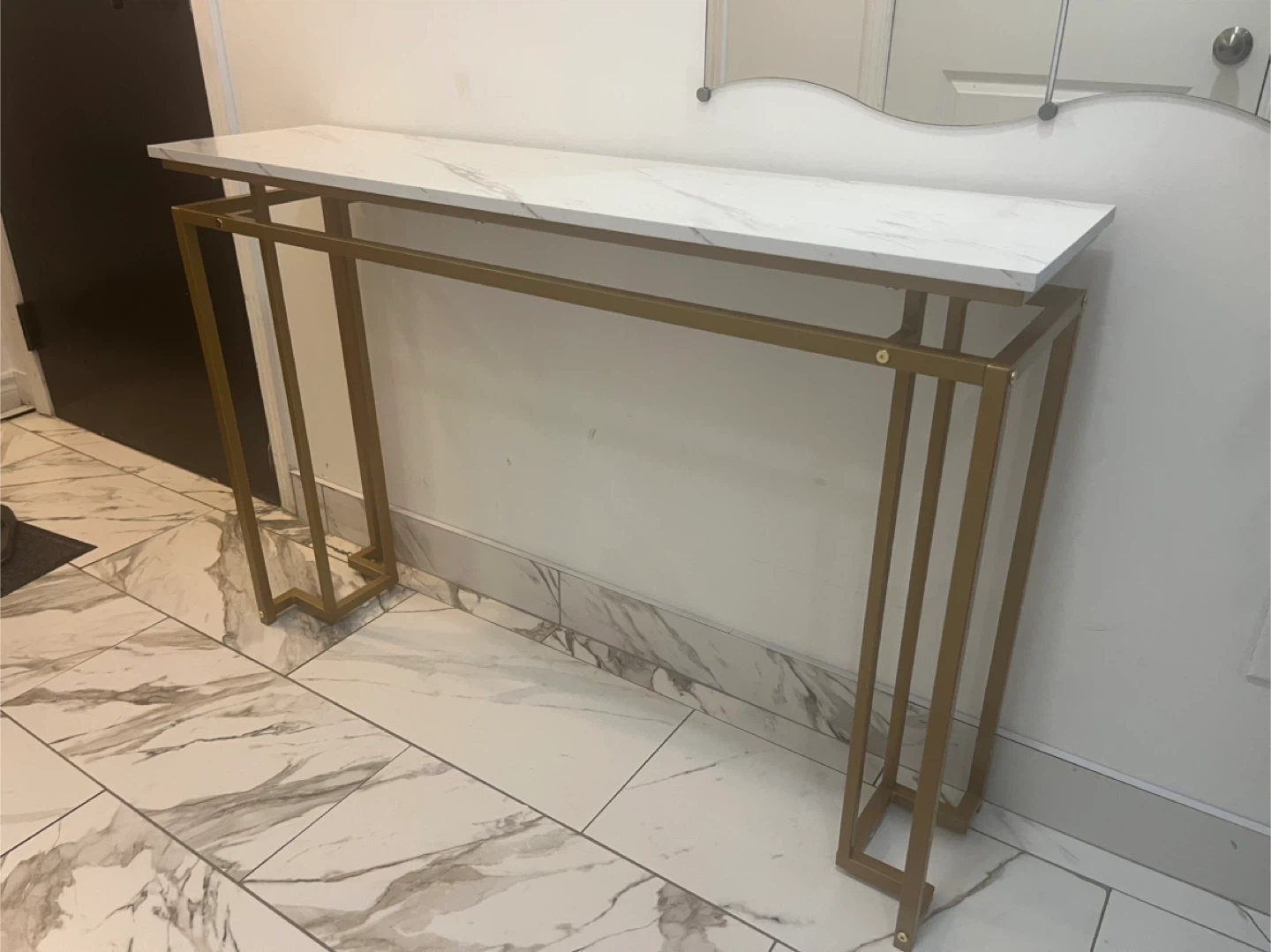 Slim console table with a white marble-look top and a gold metal frame. Its minimalist design fits well in entryways or behind sofas. Metal frame with a marble pattern laminate top.