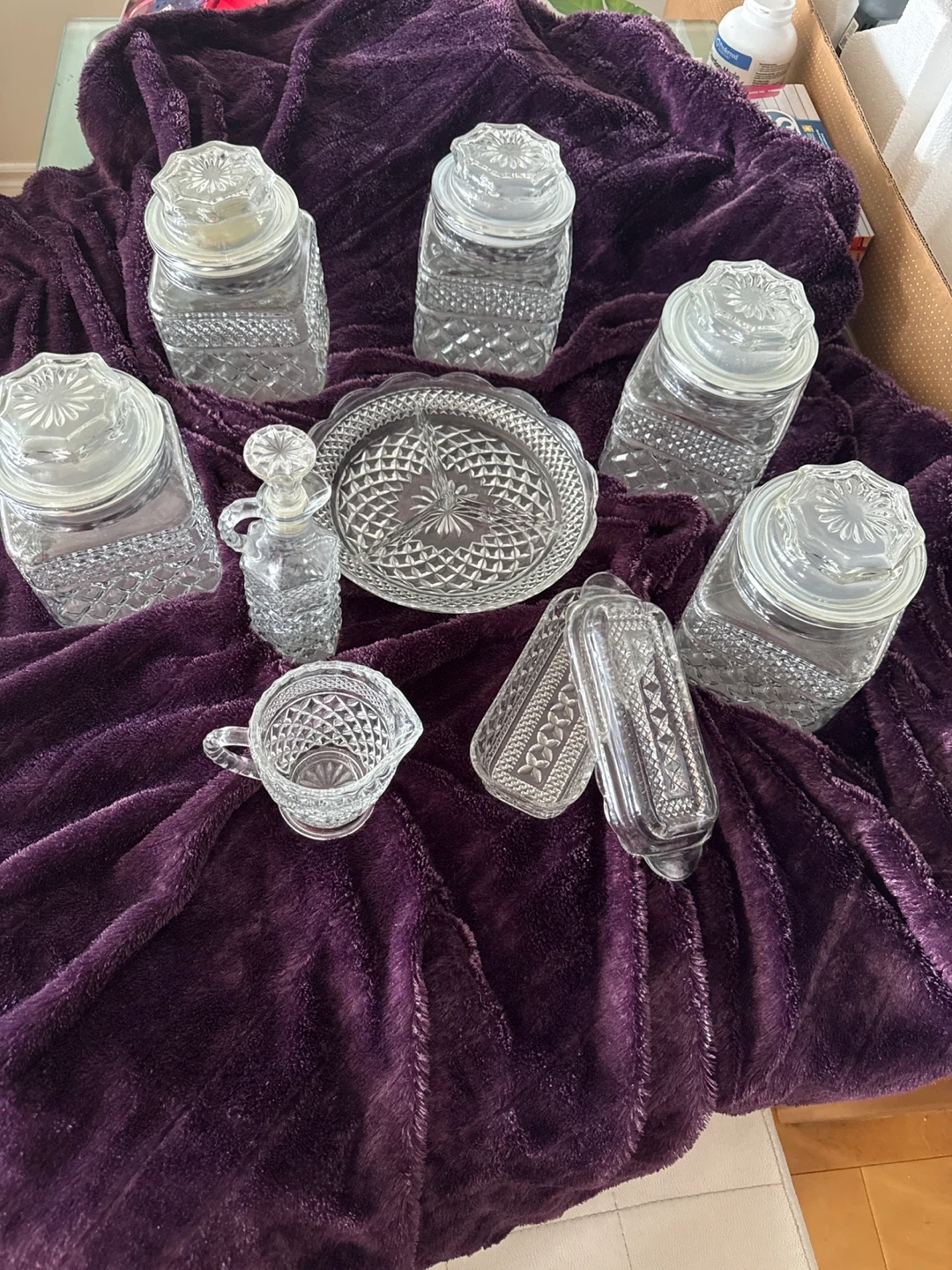 This is a set of glass canisters with decorative lids. It includes a divided serving tray and a small creamer pitcher. The glass is clear with an etched pattern.