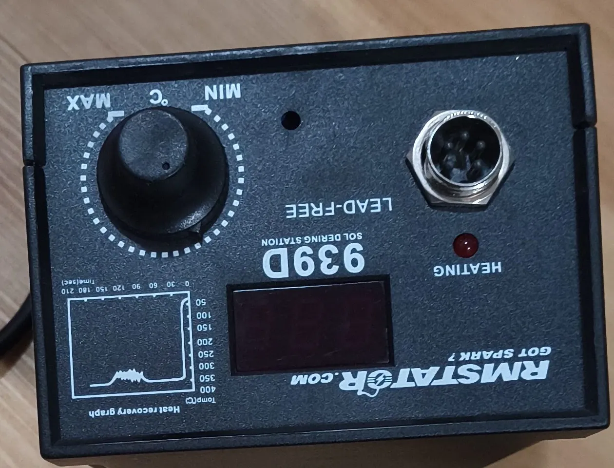 This RMSTAR 939D soldering station is lead-free. It has a temperature control dial and a heat recovery graph. The unit displays temperature in Celsius.