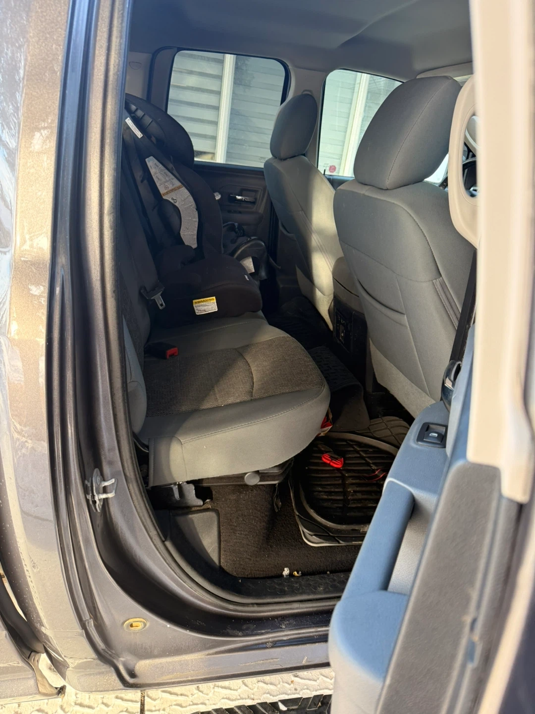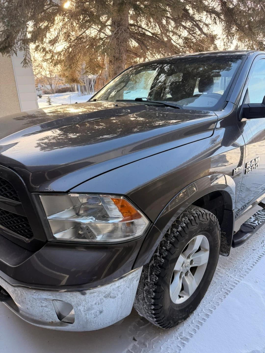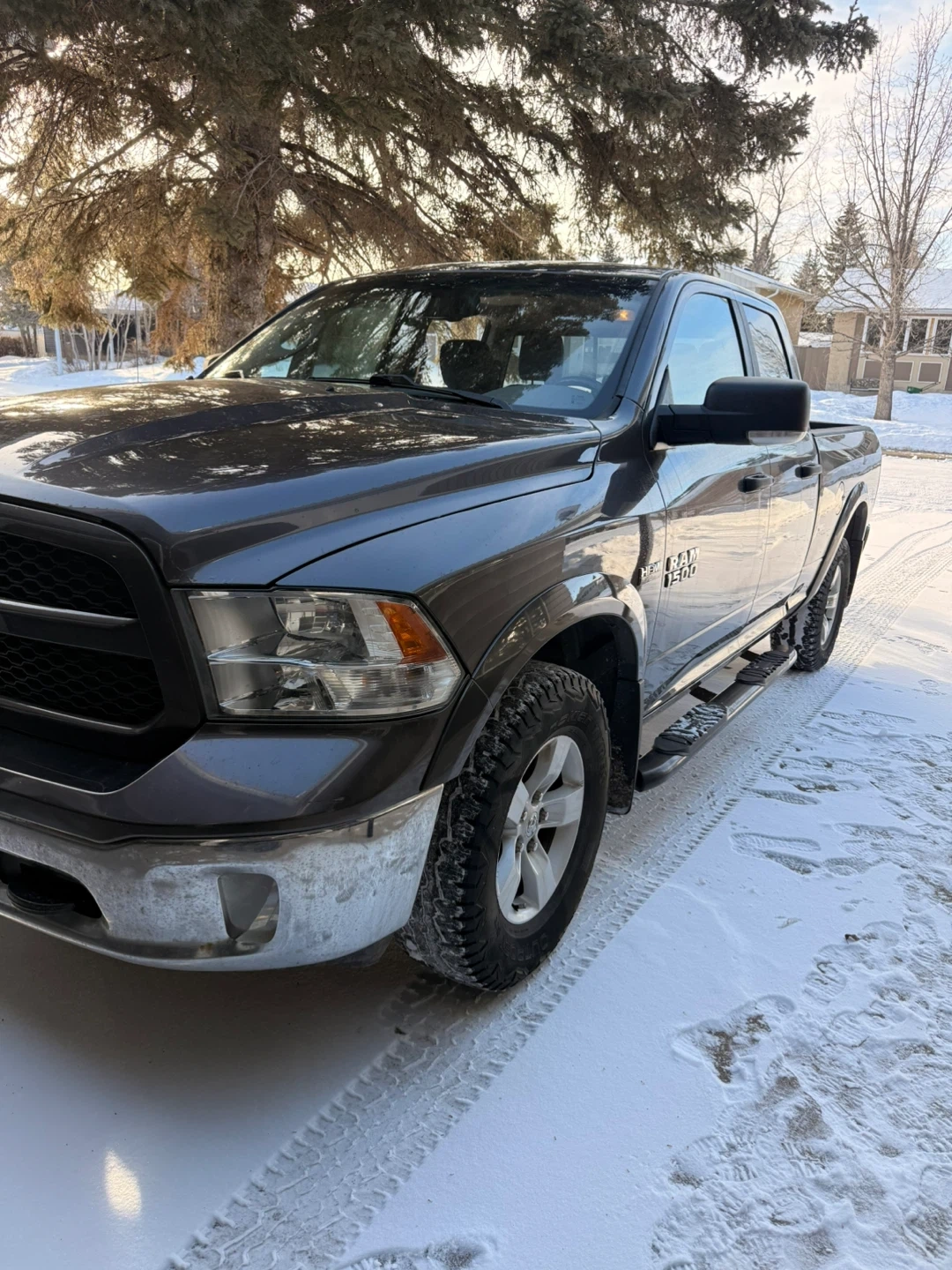 Grey Dodge Ram 1500 pickup truck with 4x4 capability. It's a crew cab model with running boards. Truck has a towing hitch. It's equipped for all seasons!
