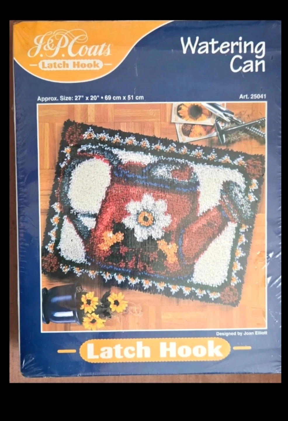 This is a J&P Coats Latch Hook kit for creating a watering can design. The approximate finished size is 27" x 20". It includes everything needed to complete the project.