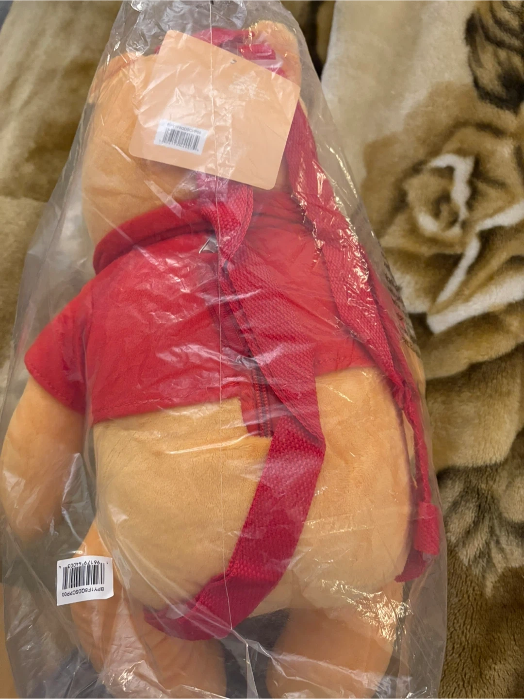 This is a Winnie the Pooh plush backpack. It's dressed in his classic red shirt and has a red scarf. Soft and cuddly for any fan!
