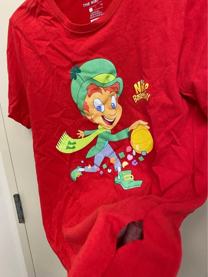 This is a pre-owned Nike Basketball Kyrie Irving Lucky Charms T-Shirt in Men's Size Small, perfect for St. Patrick's Day. Please note there is a small hole in the seam, as shown in the photos.