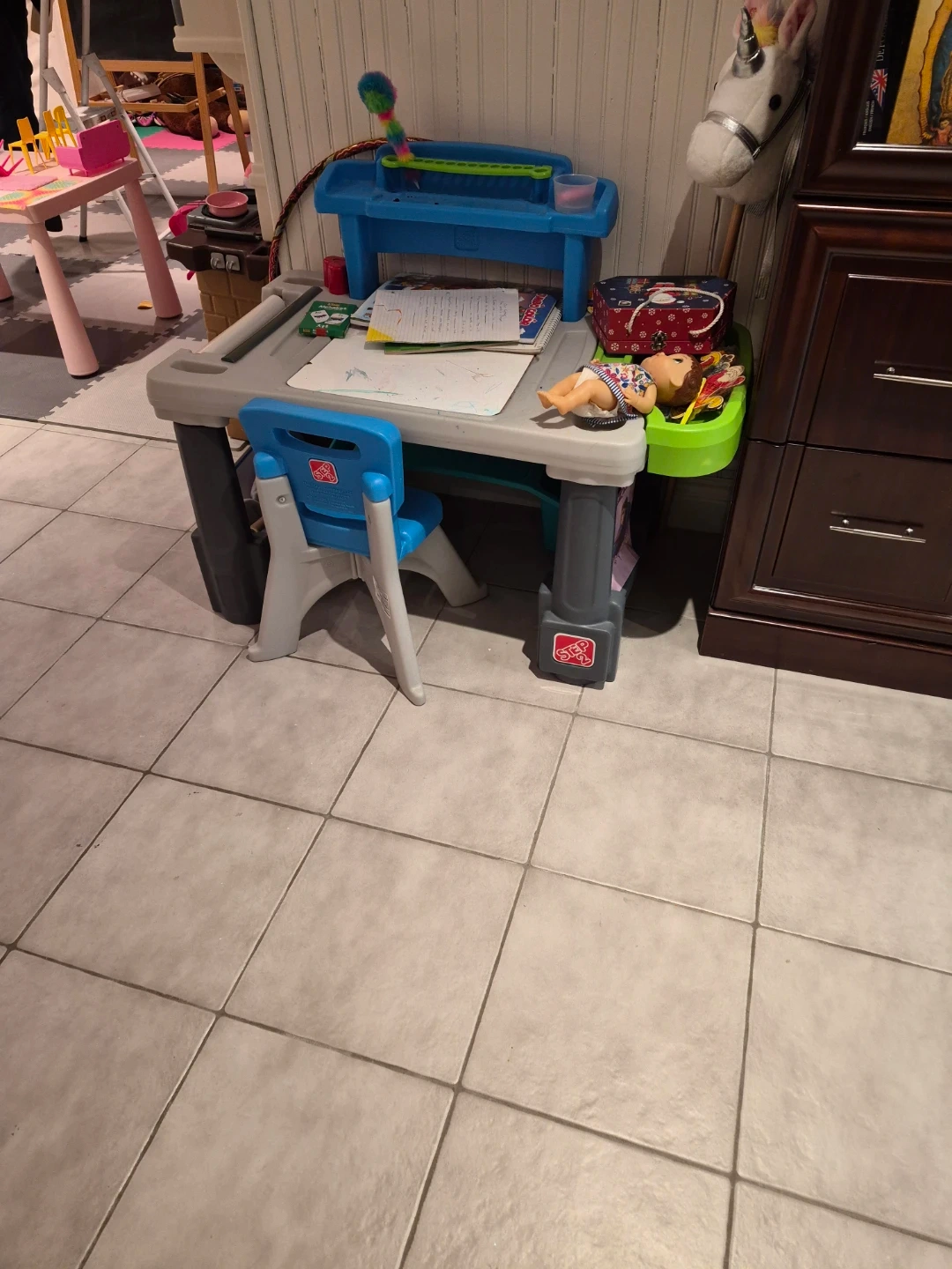 This is a Step2 art desk and chair set designed for kids. It features a blue organizer on top and a grey desk with a blue chair. Plenty of space for drawing and crafts!