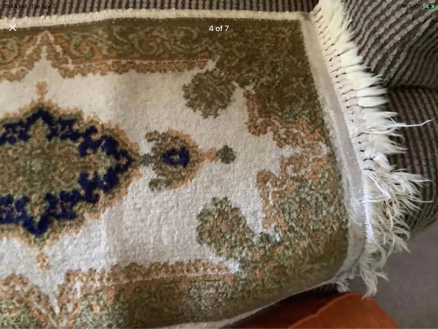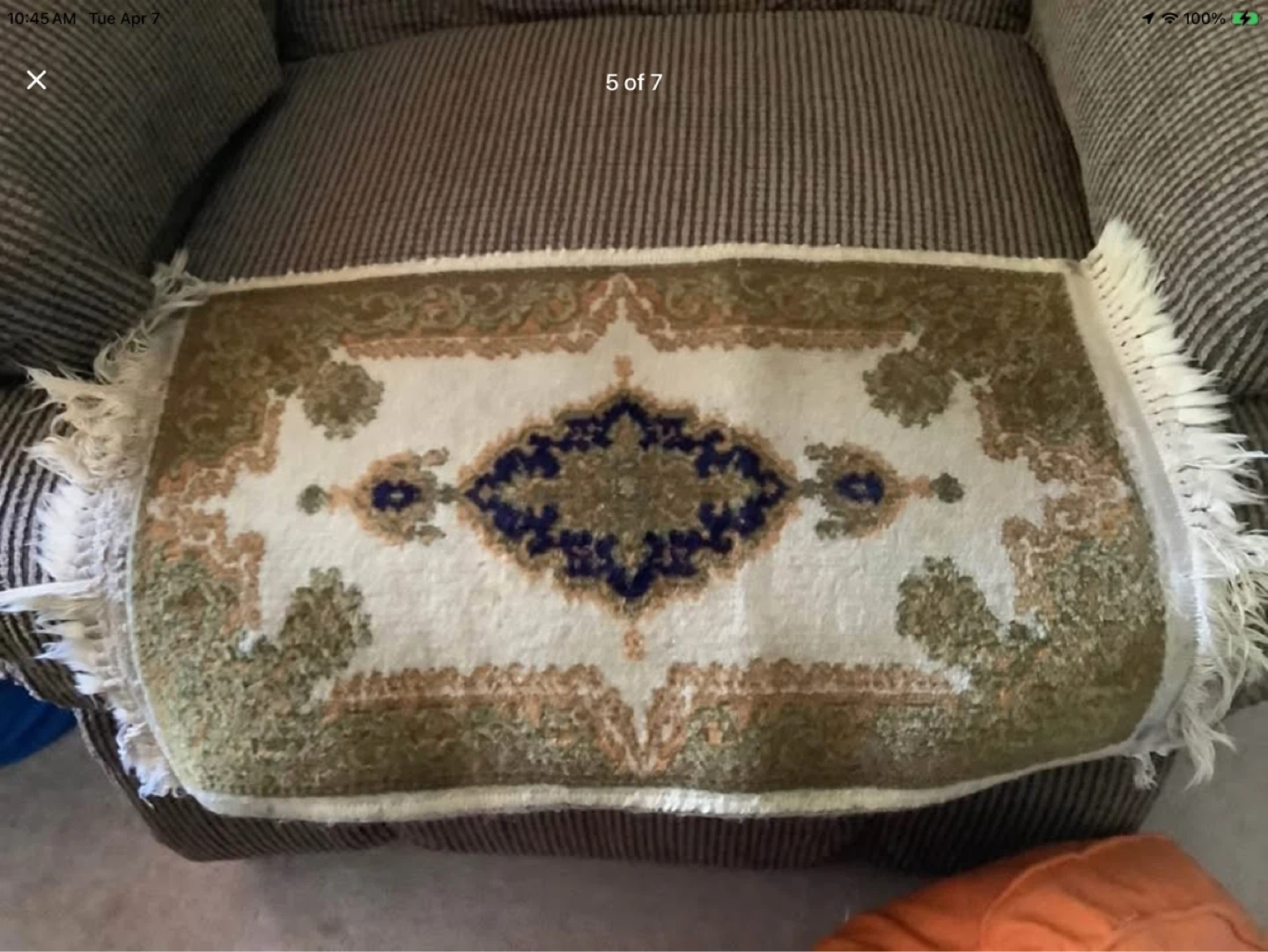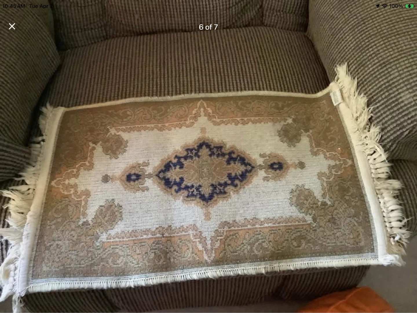 Lovely patterned fringed prayer rug.