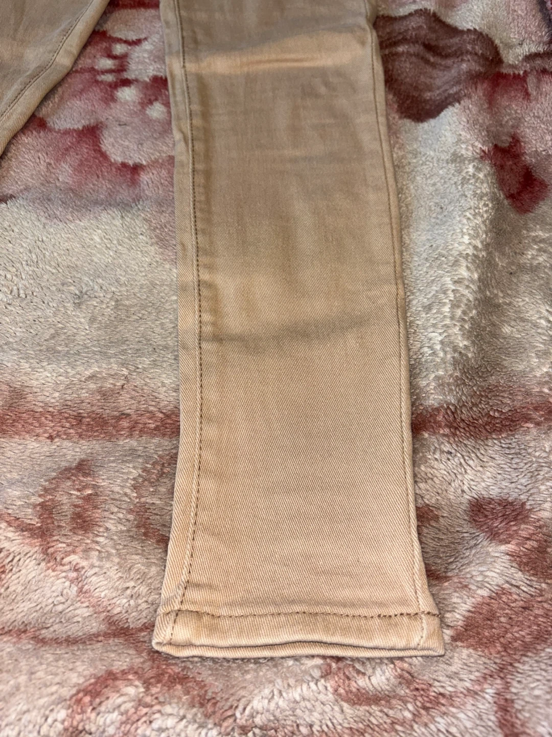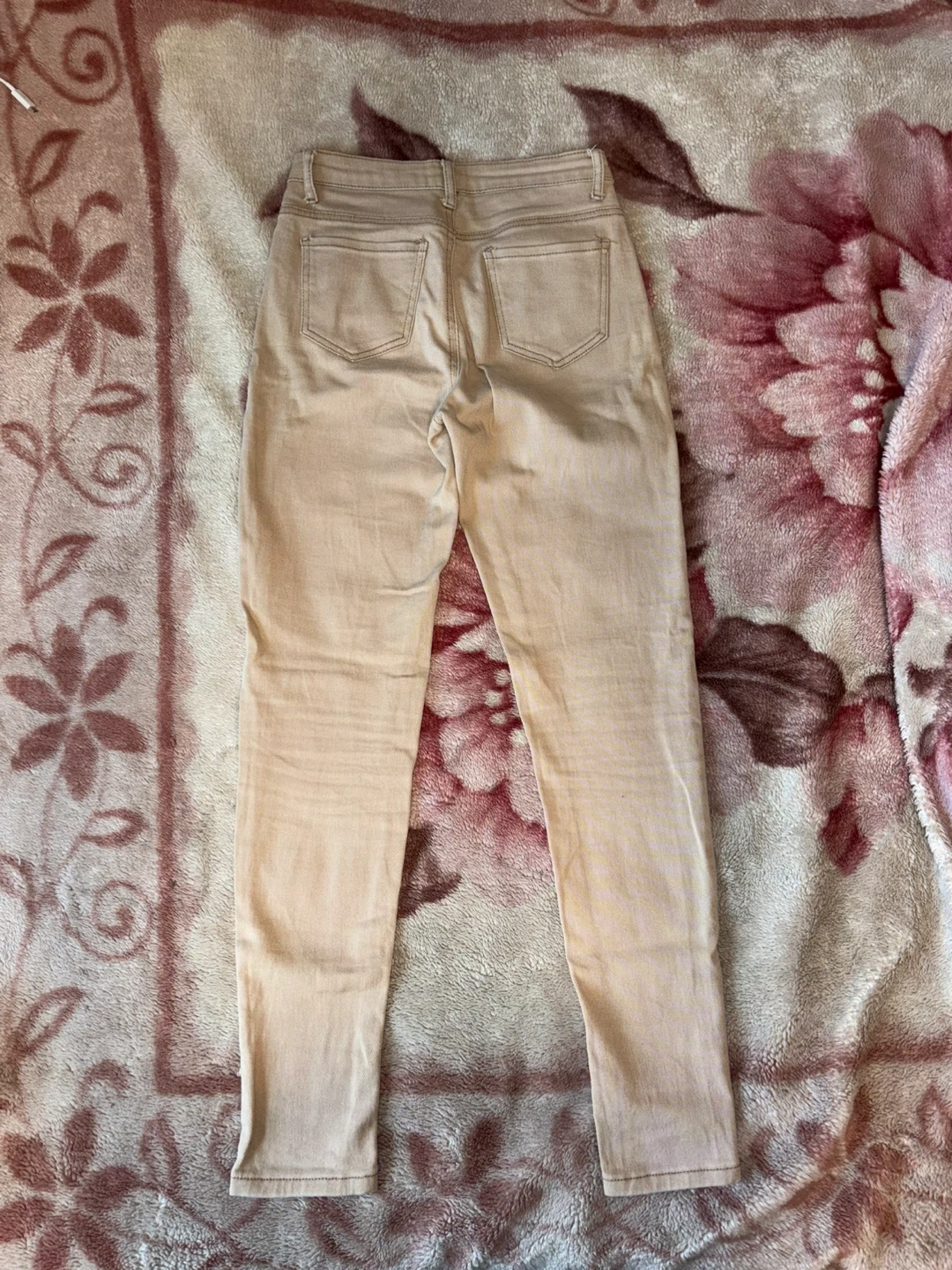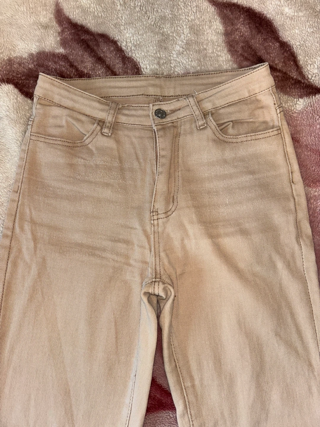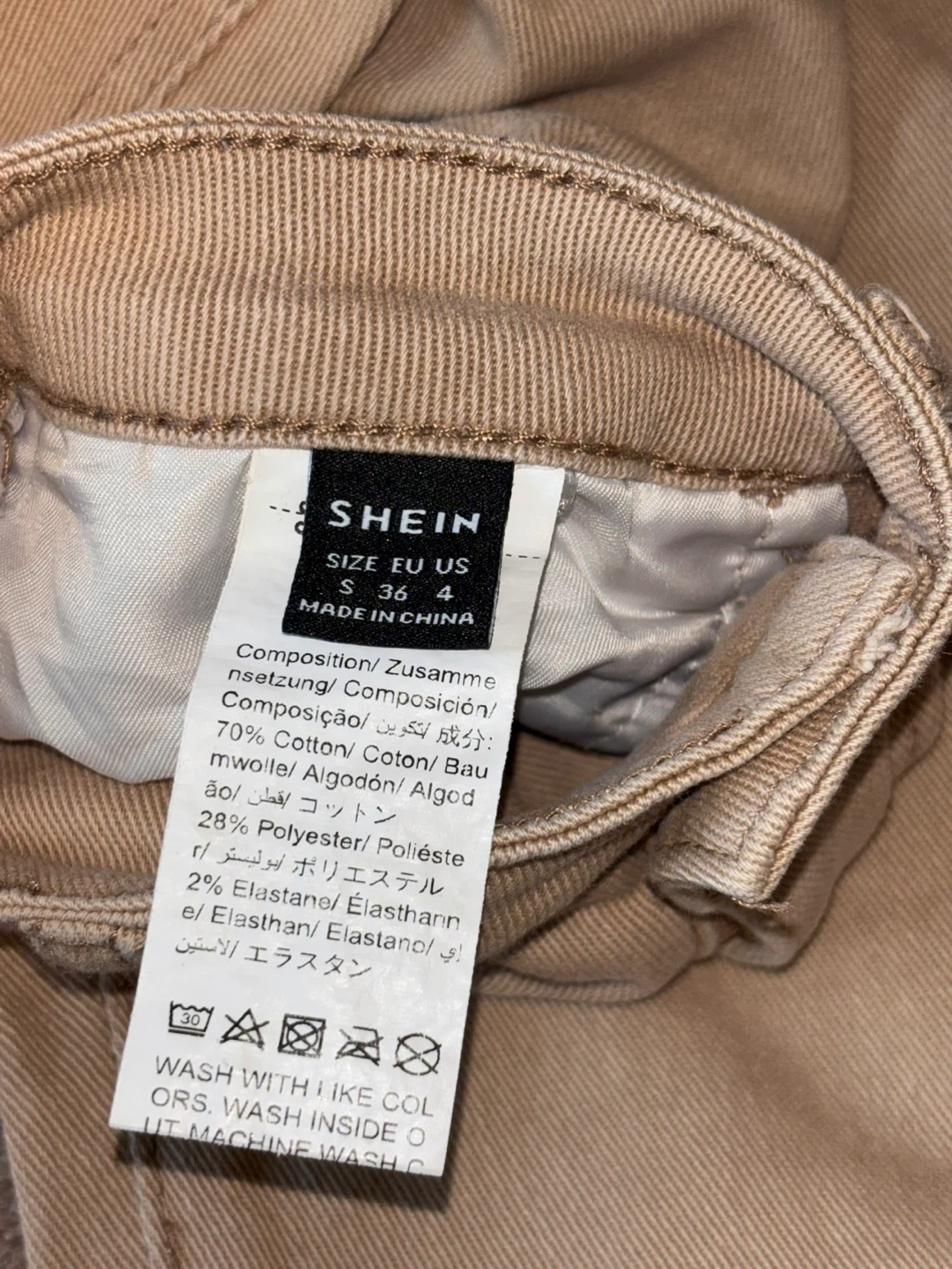 These are beige skinny jeans from SHEIN. They're made with 70% cotton, 28% polyester, and 2% elastane. These pants are great for everyday wear! Size small.