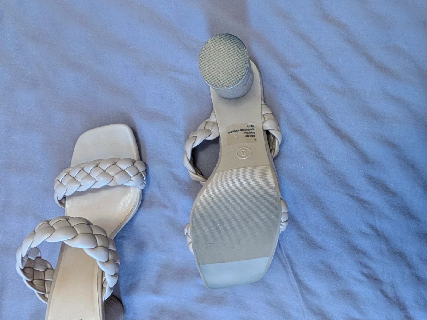 Target slide sandals feature a stylish braided strap design and a comfortable block heel. They're a cream colour and come in a size 8. Perfect for adding a touch of chic to any outfit!
