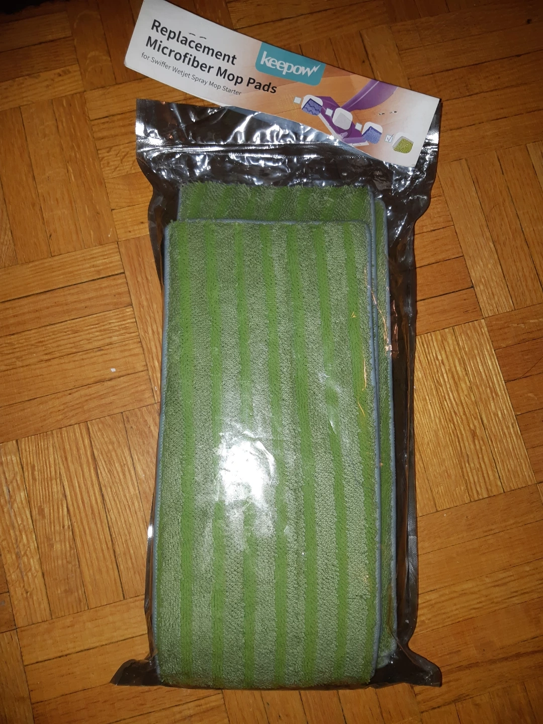 These are replacement microfiber mop pads. They're designed for all floor surfaces and offer strong water absorption. The pads are washable and reusable, making them a practical choice for cleaning! Includes 5 pads and mess bag for washing