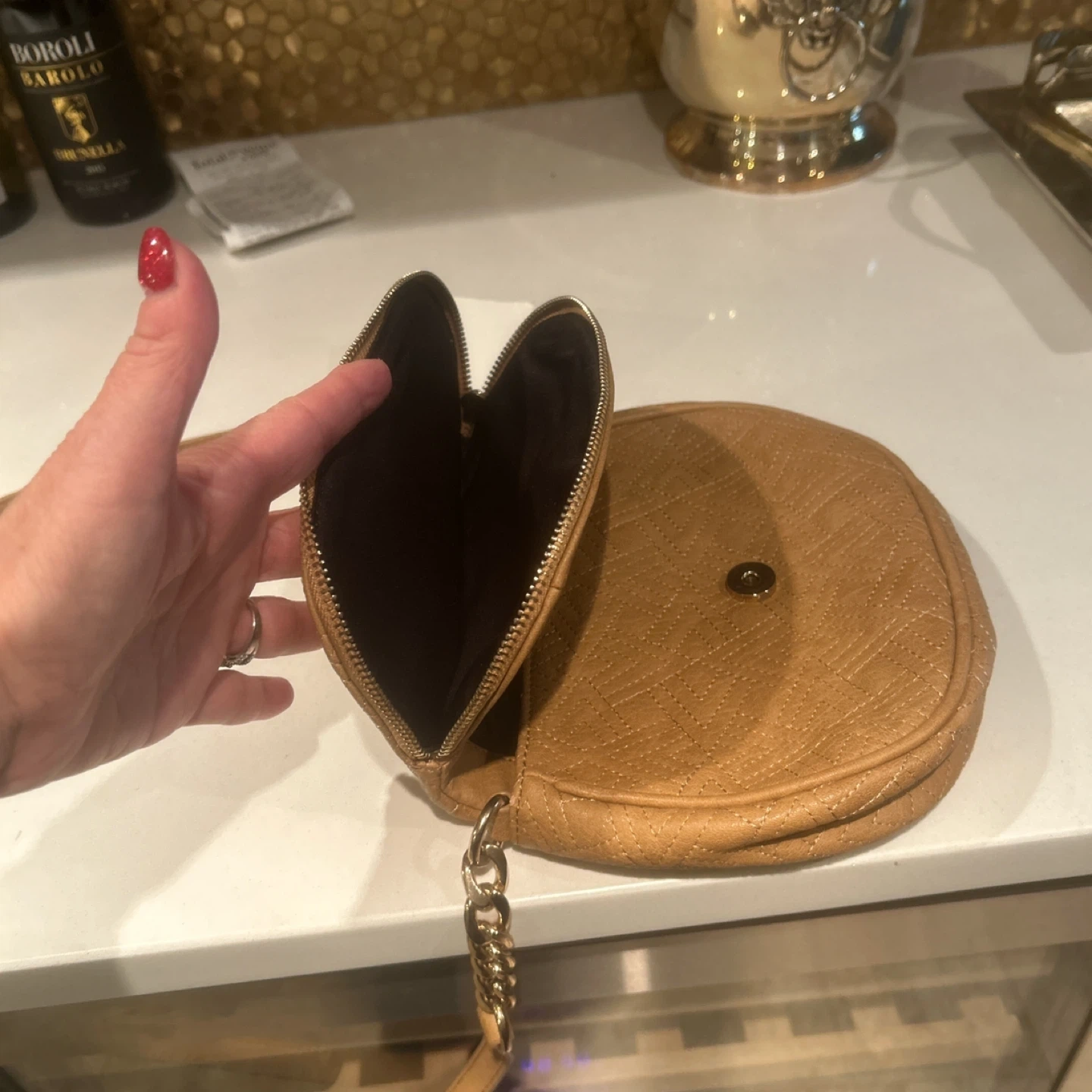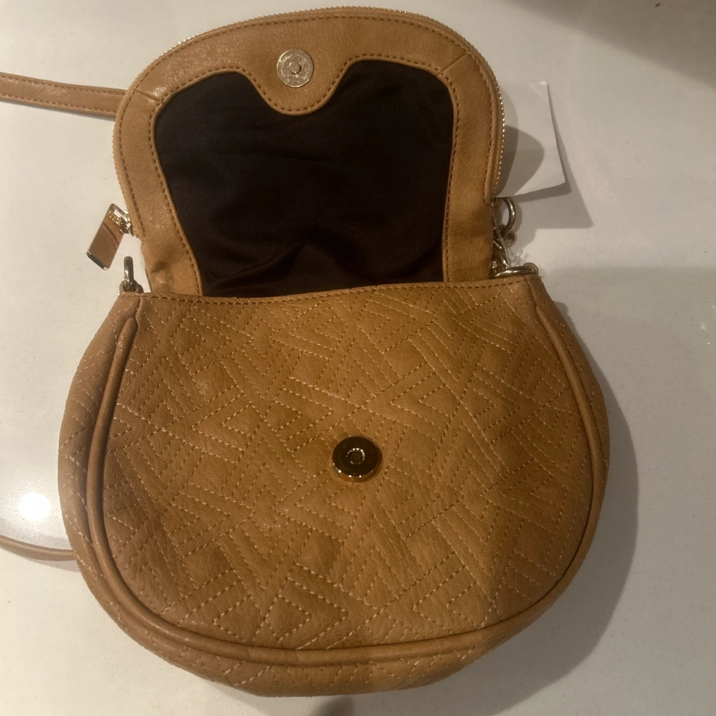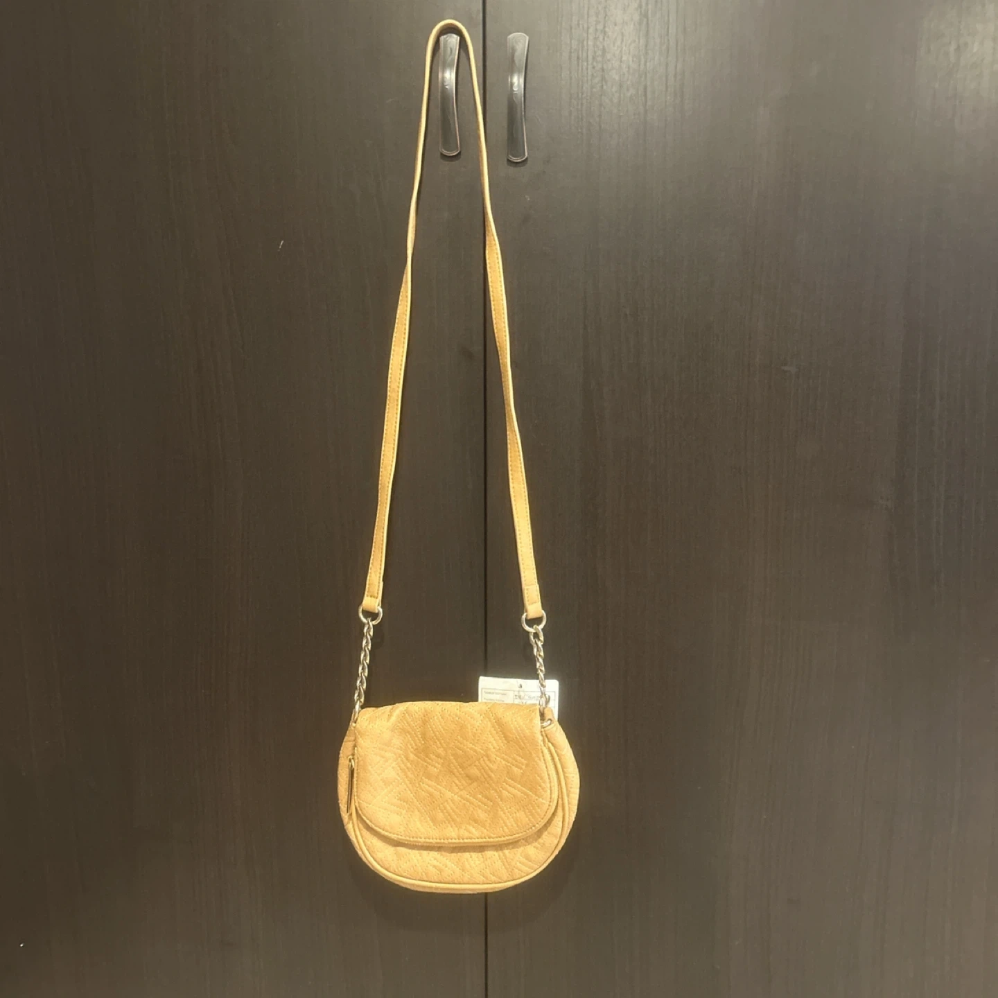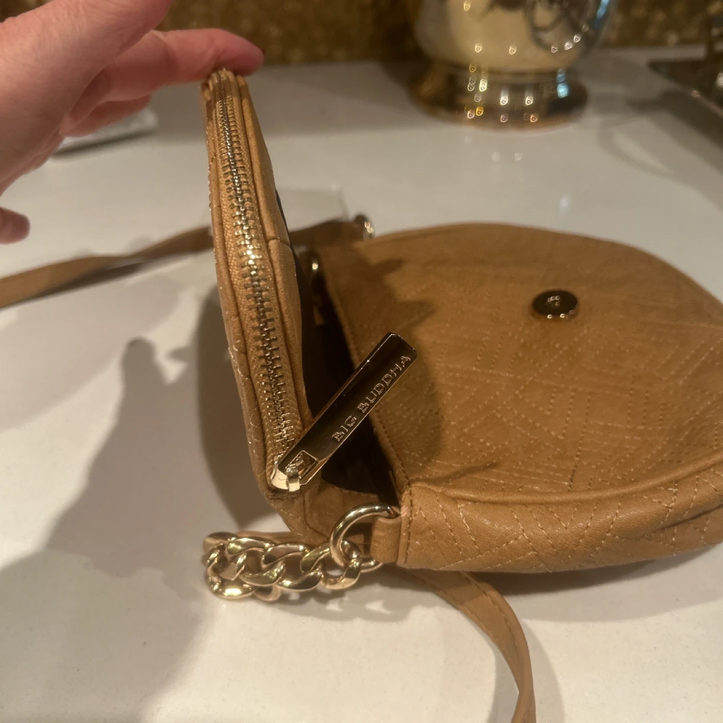 This is a cute Big Buddha crossbody bag in a tan color. Genuine Leather embossed design with sturdy zipper and chain embellishments. NWT never used. Shoulder or crossbody.