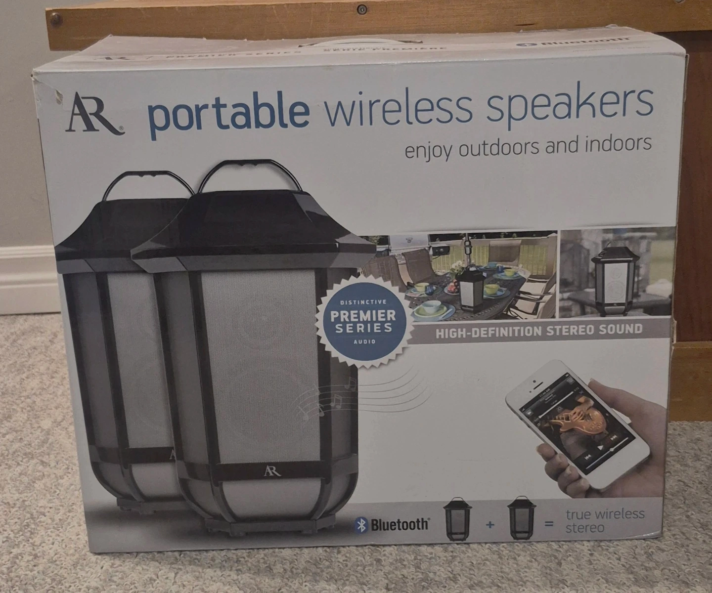 Bluetooth wireless speakers from AR's Premier Series. Distinctive Audio 2-way system with enhanced bass radiator. Operates on 8 AA batteries or included AC adapter, offering up to 14 hours of play time.
