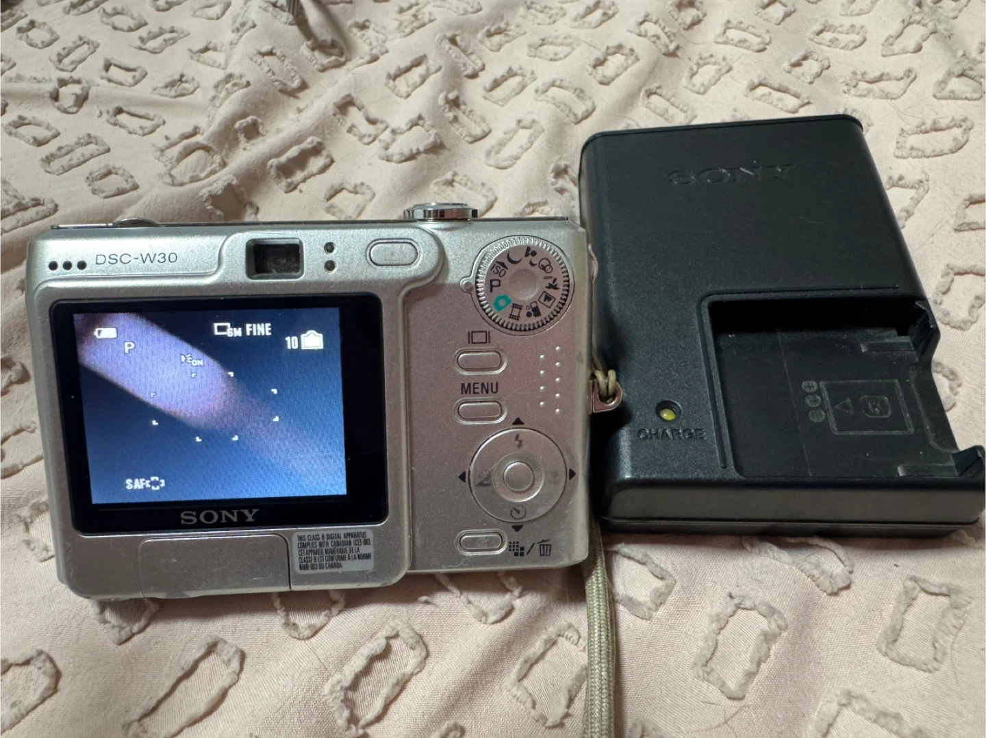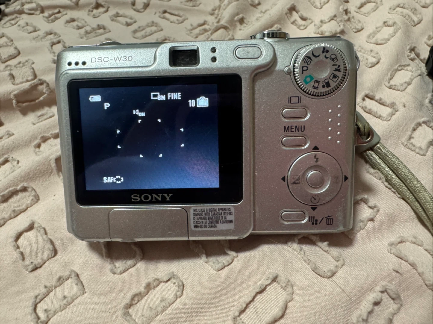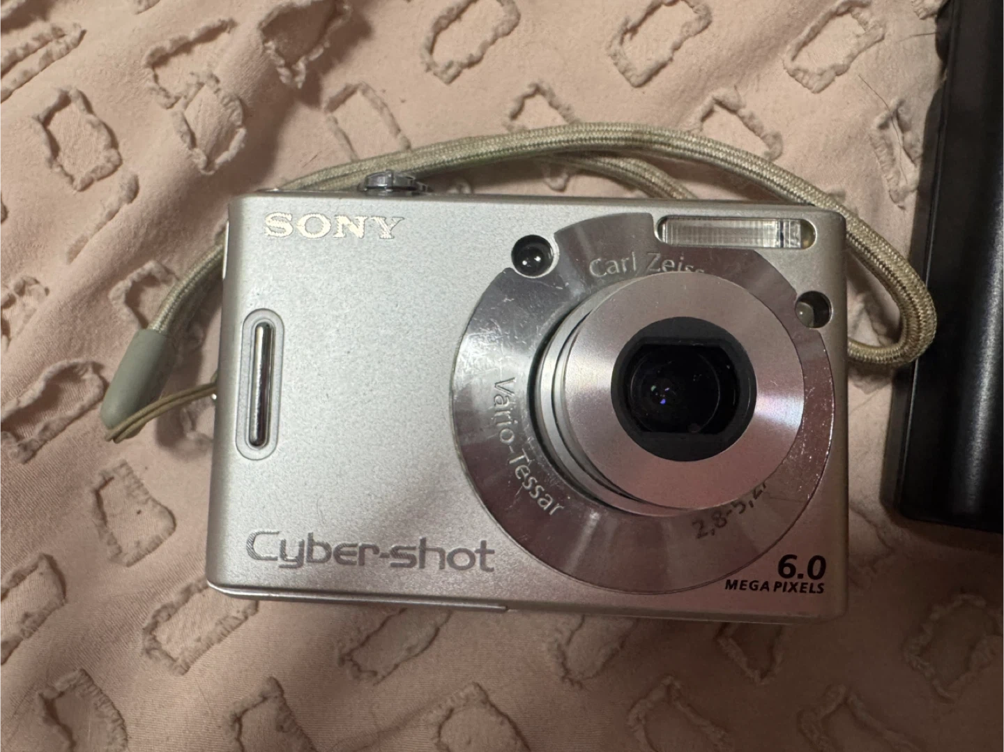This is a silver Sony Cyber-shot DSC-W30 digital camera. It features a 6.0 megapixel Carl Zeiss Vario-Tessar lens. It comes with a charger and battery.
