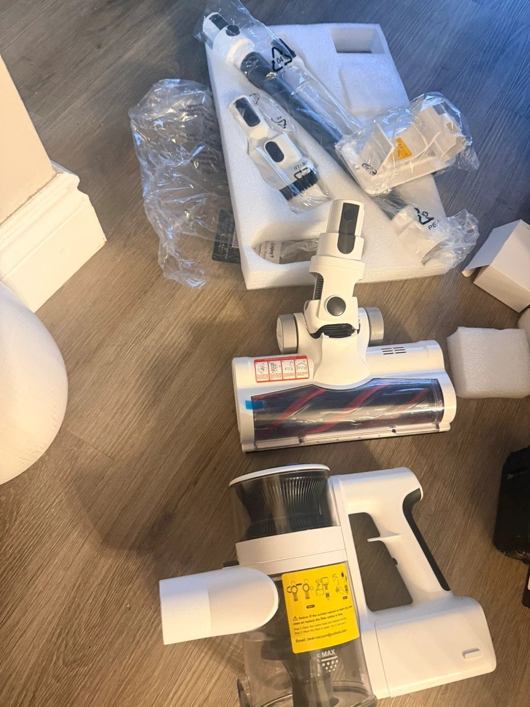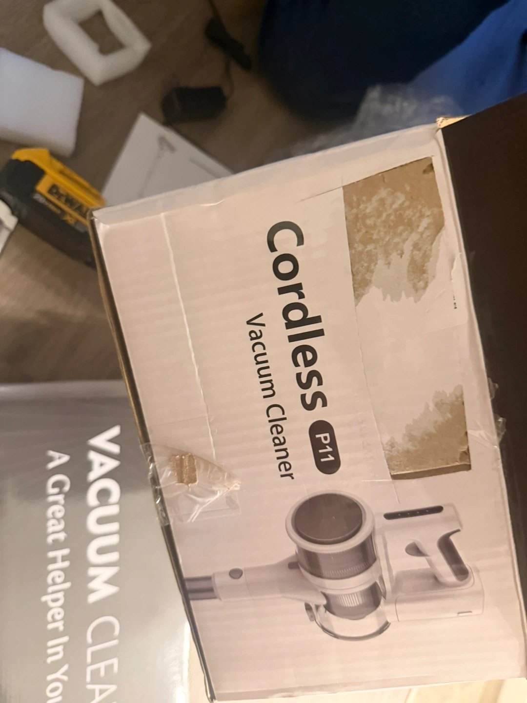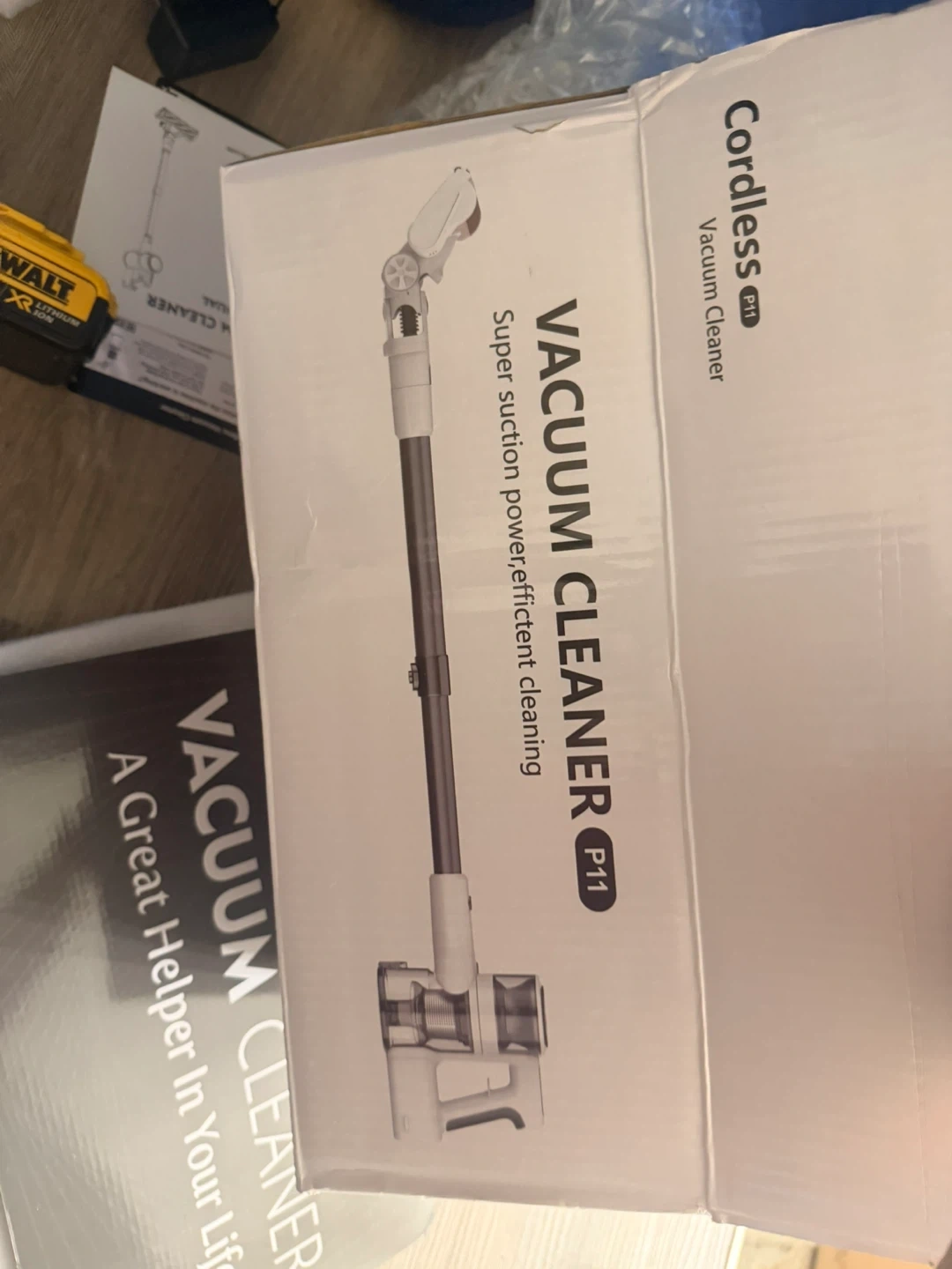 This is a cordless vacuum cleaner, model P11. It features super suction power for efficient cleaning. Includes all shown accessories and original box.