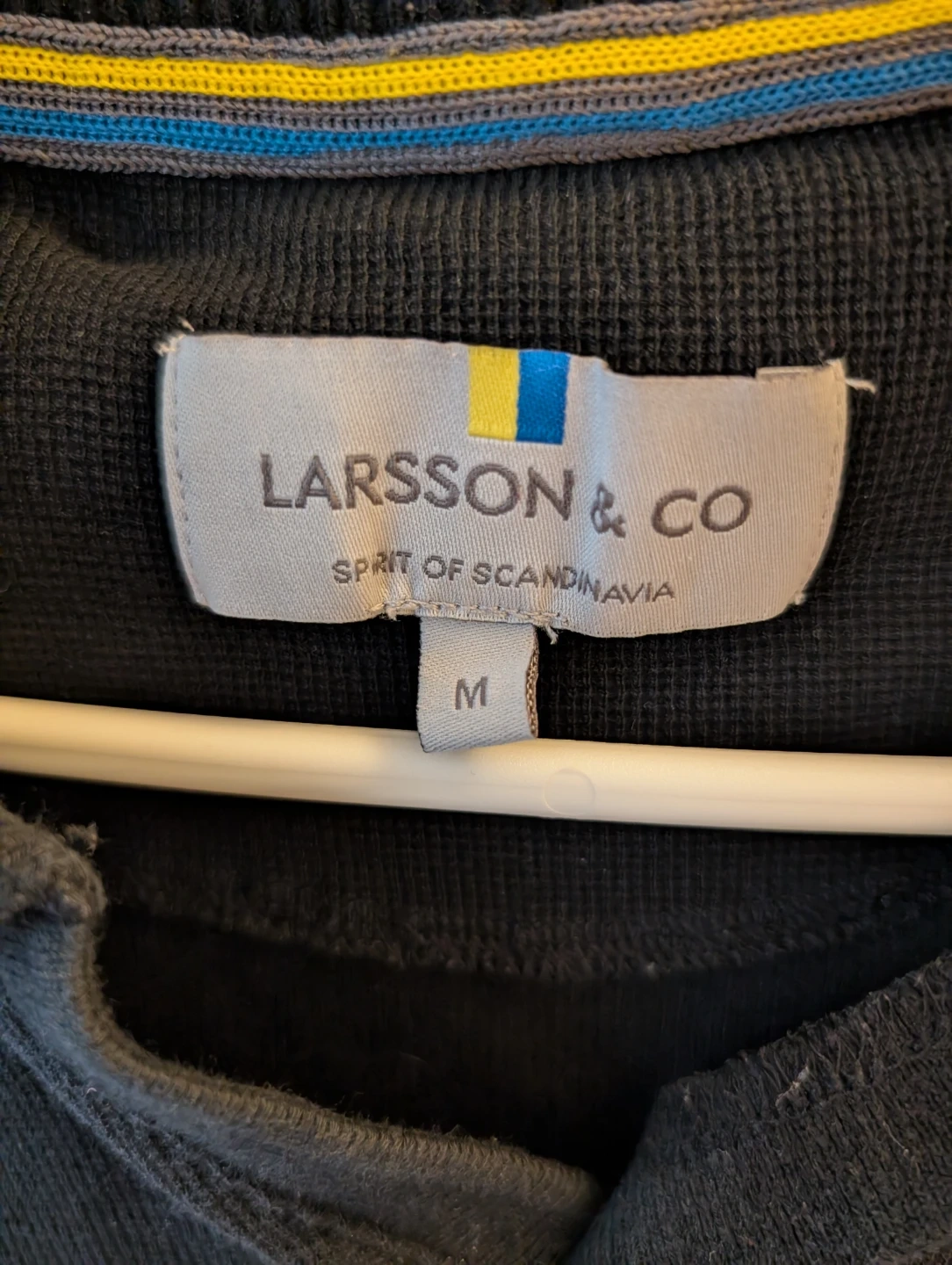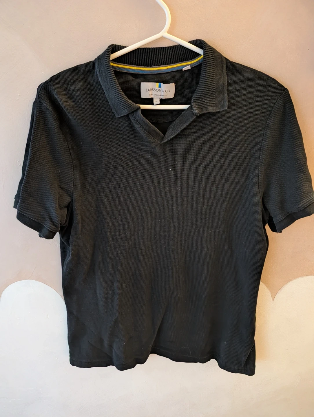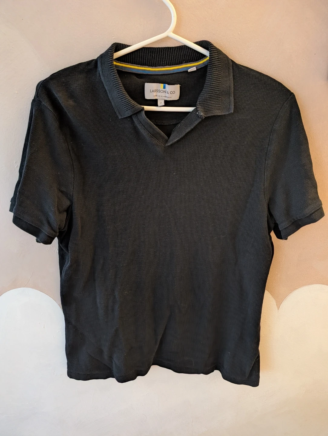 A men's short sleeve polo shirt from Larsson & Co. It's a size medium with a textured knit fabric. The collar has a ribbed design. This polo is suitable for casual wear.