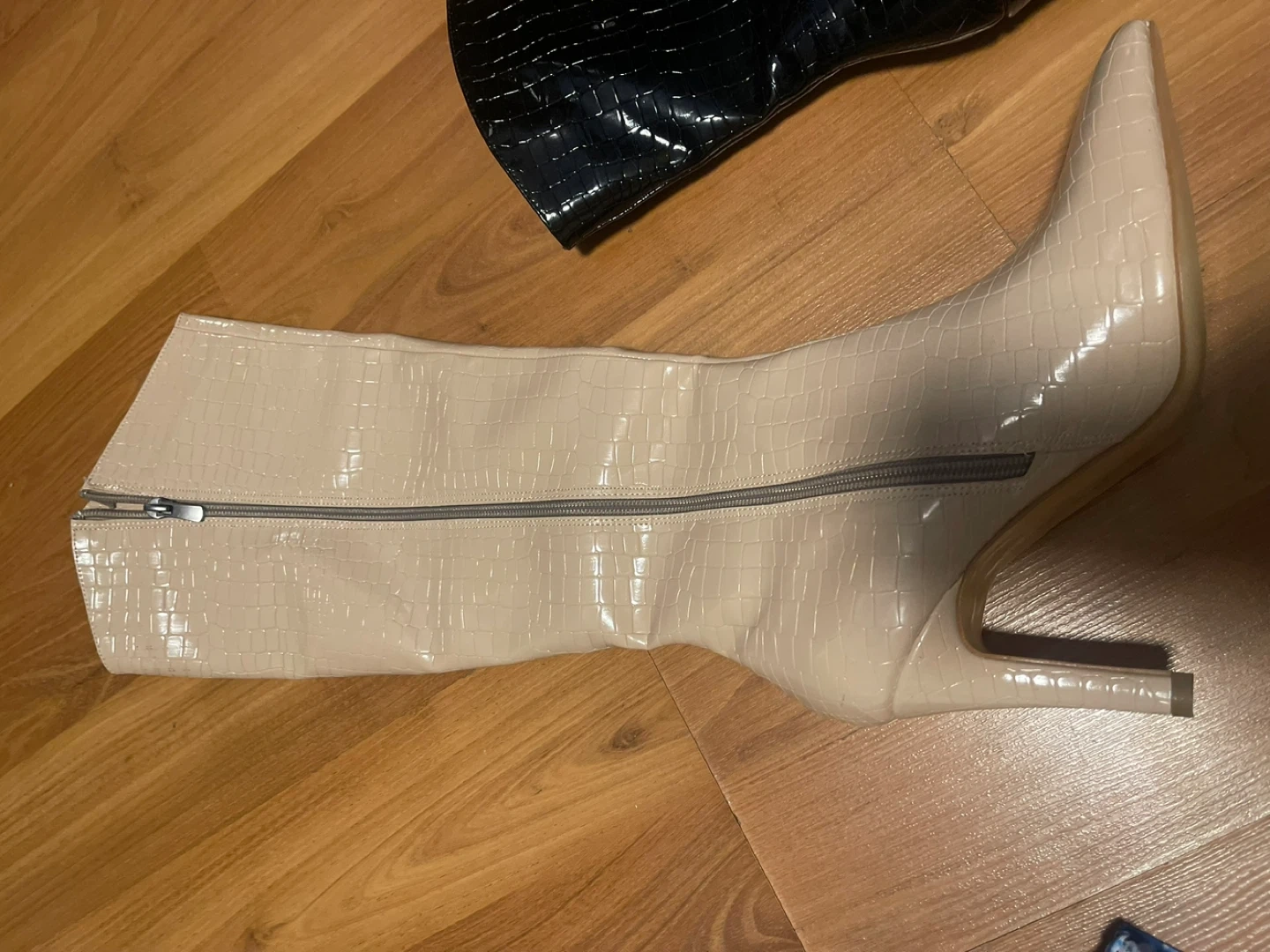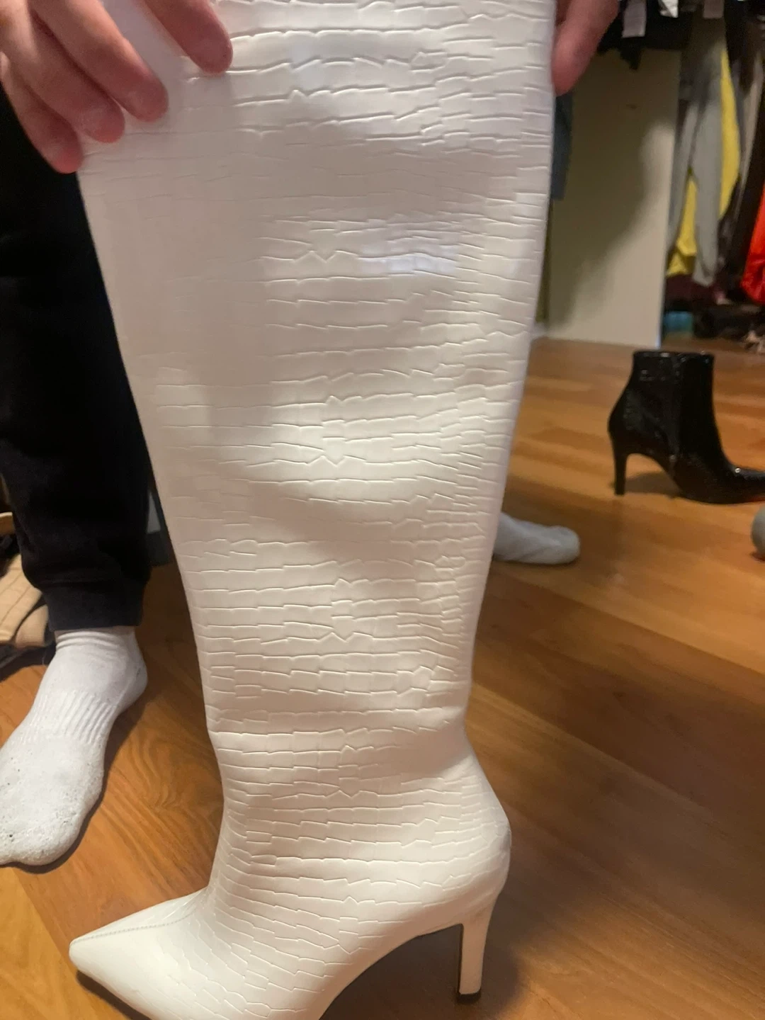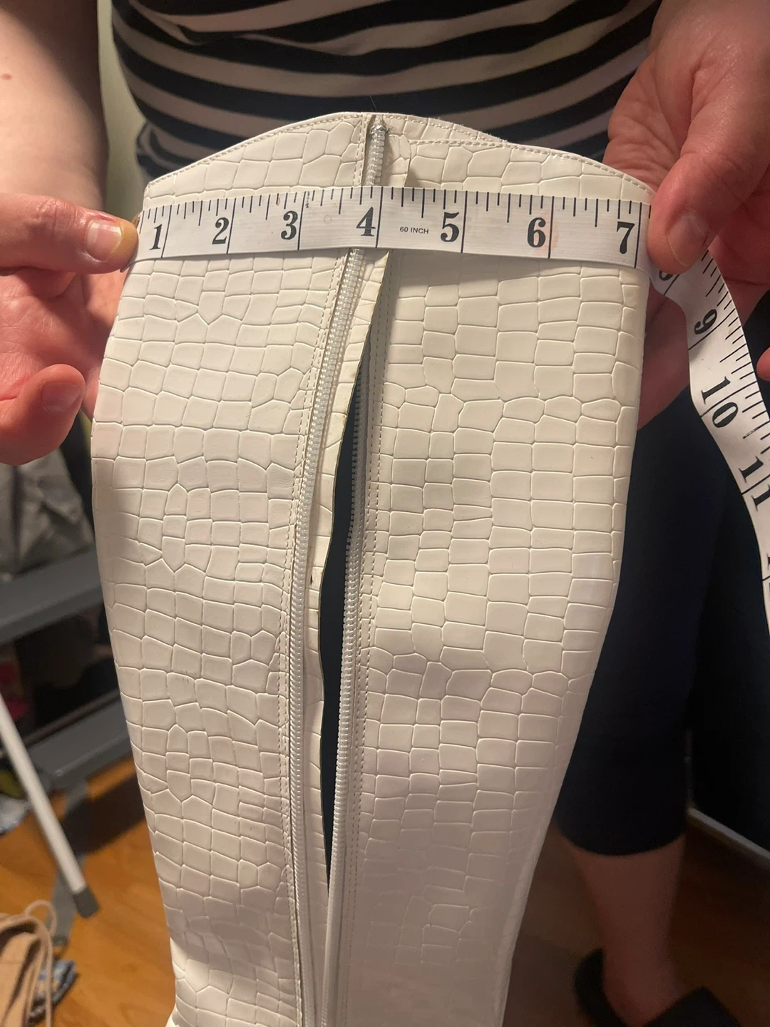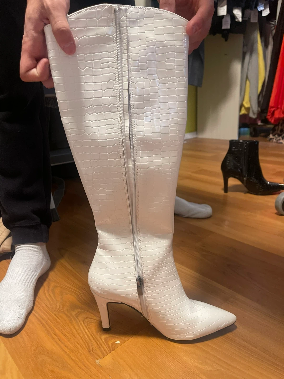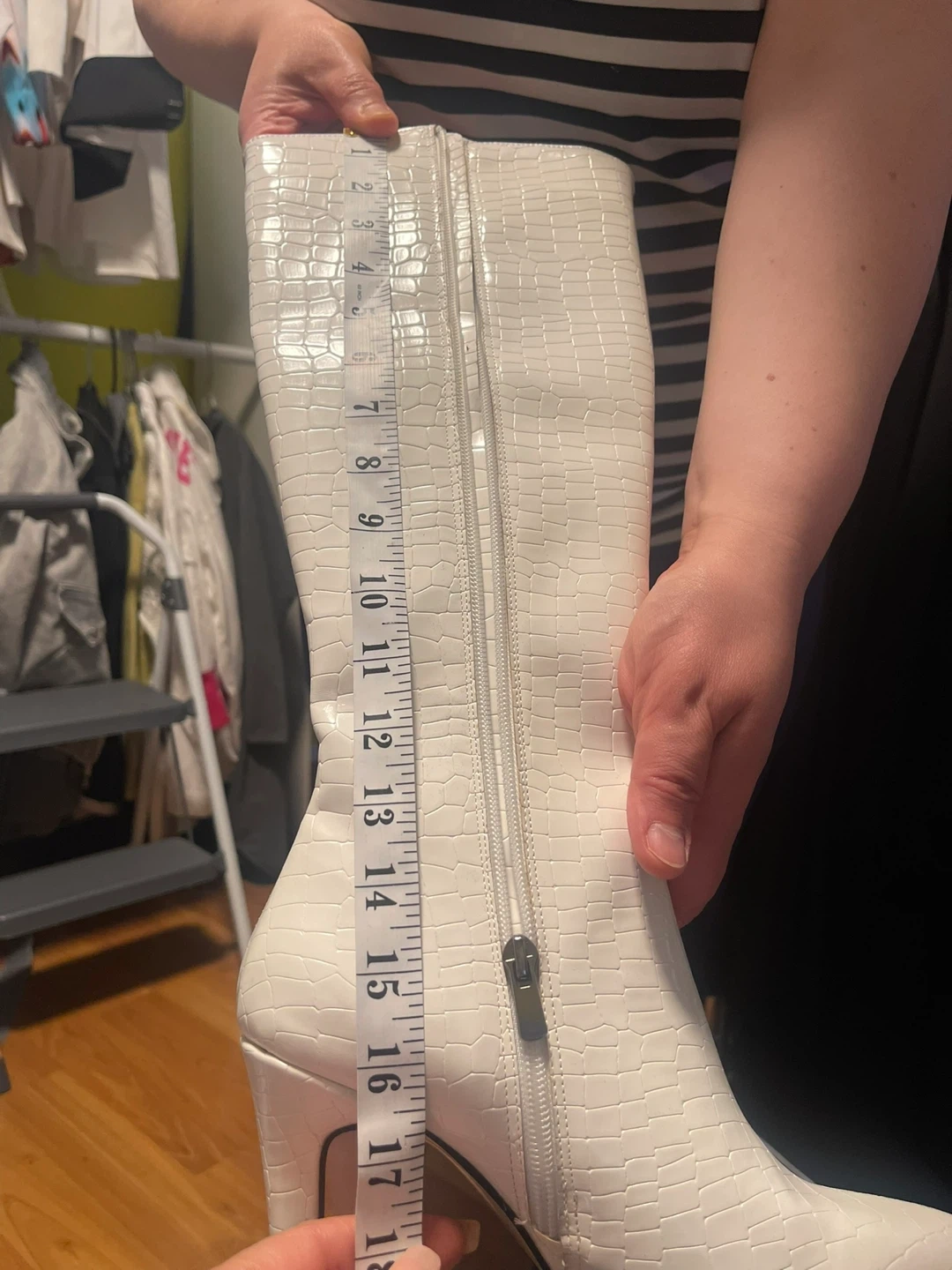 White knee-high boots with a croc embossed pattern and pointed toe. Heel height is approximately 3.5 inches. The shaft measures about 15 inches tall, and the opening circumference is about 15 inches. It's a stylish choice for many outfits!