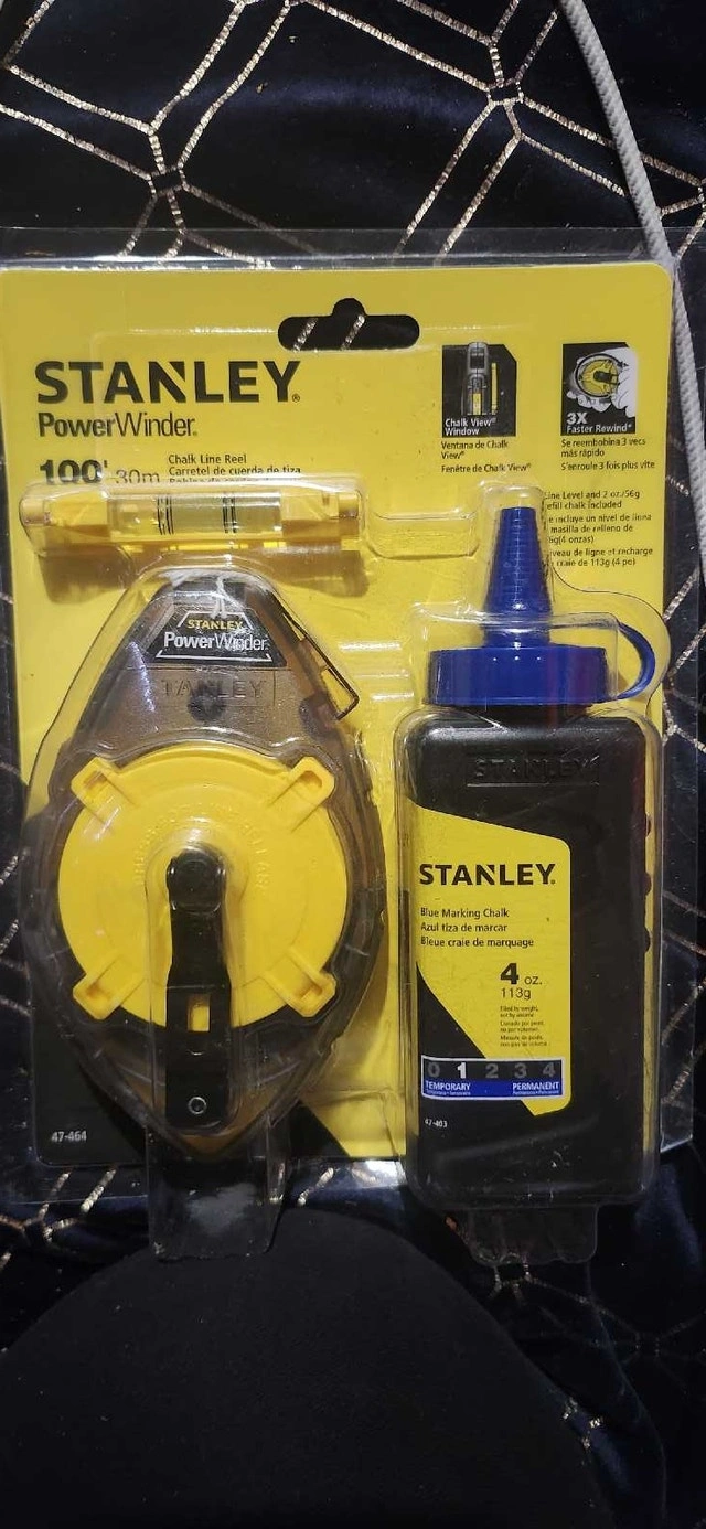 This new Stanley PowerWinder chalk line reel set features a (30m)100-foot chalk line, a level, and a 4-ounce bottle of blue chalk for marking clear, precise lines. This is perfect for various layout applications.