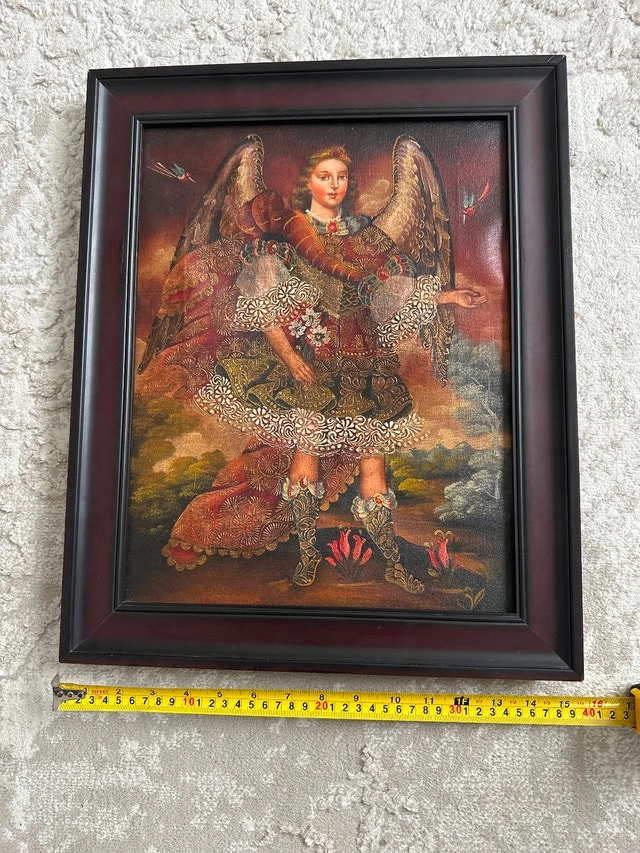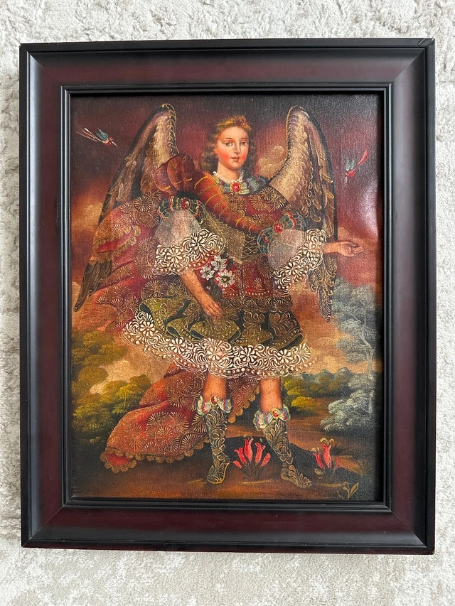 Vintage Cuzco School oil on canvas painting of Archangel Saint Gabriel. Framed: 15.25x18.75”. Used - Good condition. Art. For sale by owner. Cash accepted.