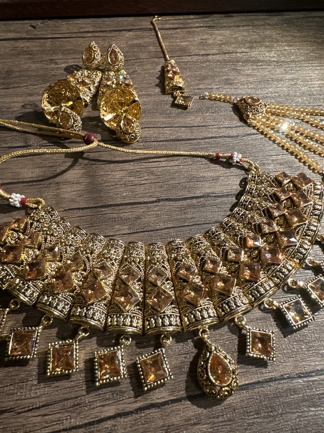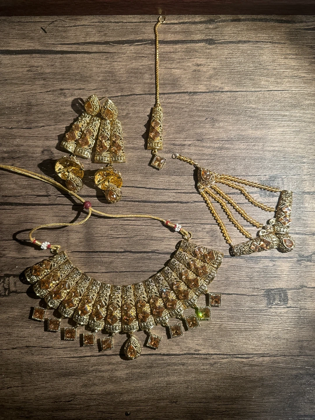 Selling a beautiful gold Indian jewelry set! The set includes a necklace, earrings, and a headpiece. The jewelry features intricate designs and would be perfect for a special occasion or cultural event. If you wanna break the set, message meπ