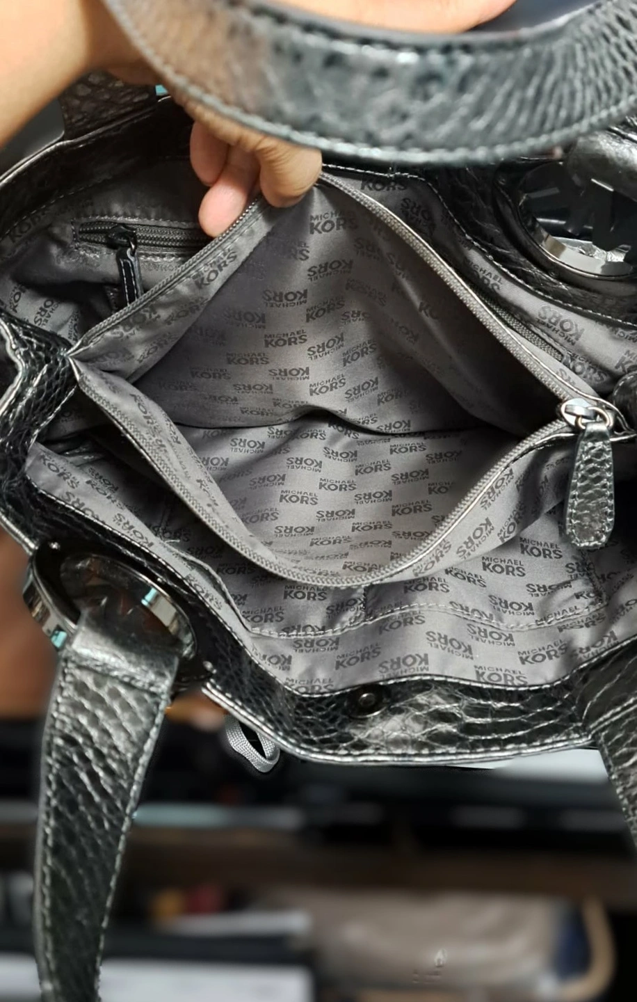 Add a touch of vintage glamour to your collection with this stunning Michael Kors Fulton East West Tote. Crafted from luxurious metallic python-embossed genuine leather in a sleek silver/gunmetal hue, this bag features the iconic oversized "MK" circular hardware that defines the Fulton line. Original price $498 USD