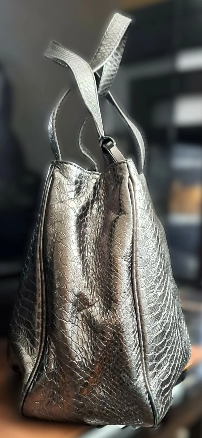 Material: High-quality python-embossed leather with a stunning metallic gunmetal/pewter sheen.